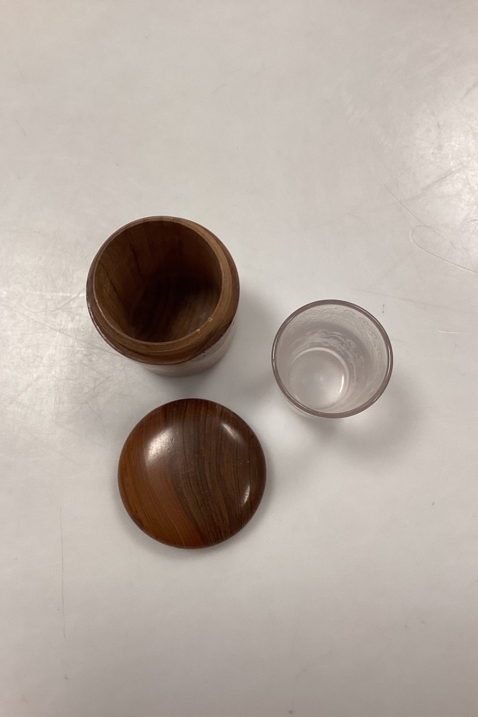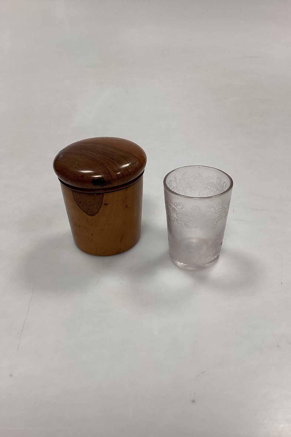 Travel Glass in wooden case with screw lid. The glass has cuts with motifs of mythical animals.