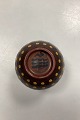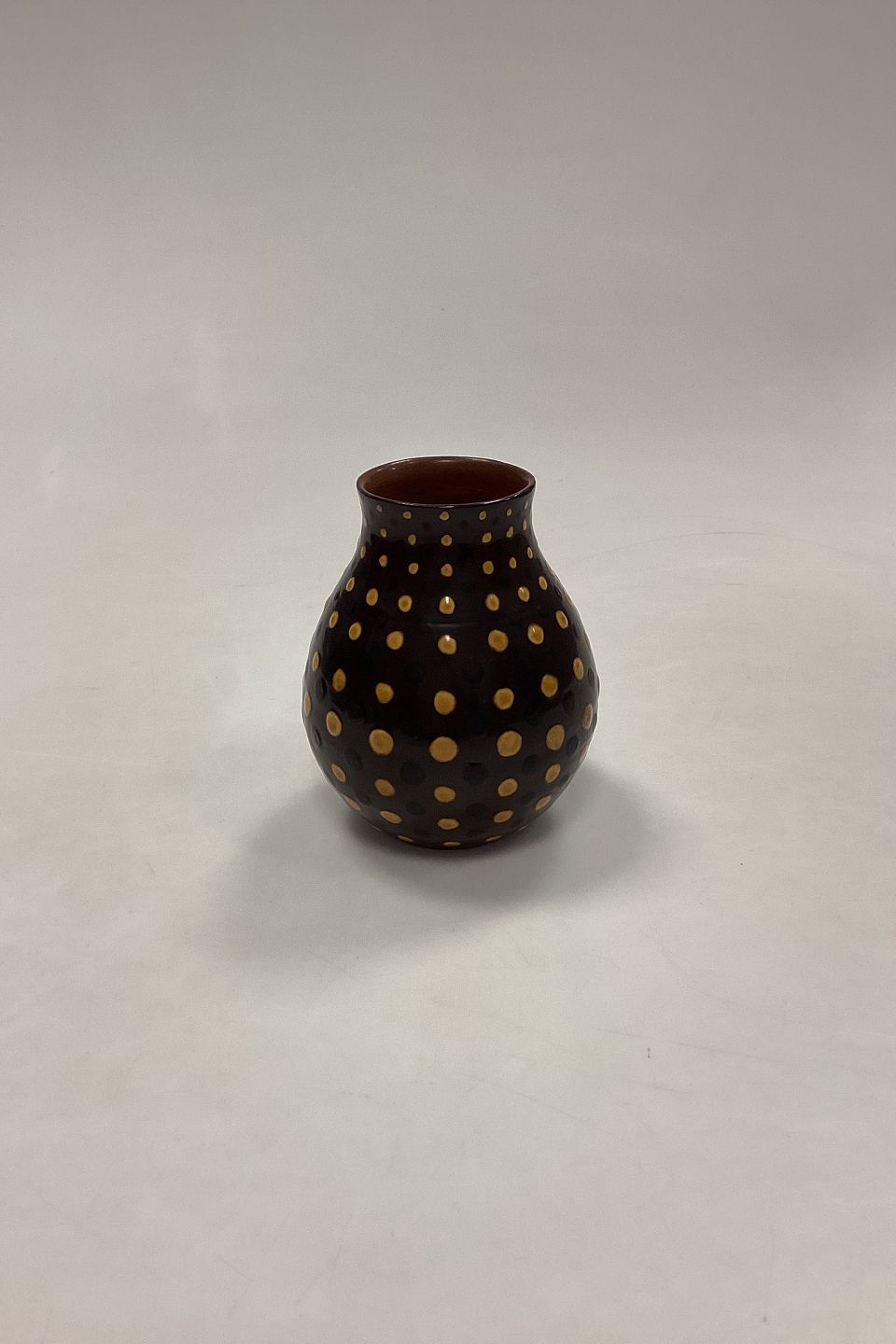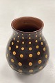Royal Copenhagen Unique Stoneware Vase by Nils Thorsson. Brown with black and yellow dots. Measures 7.5 cm x 13.5 cm / 4.14 in. x 3.35 in. and is in good condition. 4th Quality with a small chip at the top of the rim.