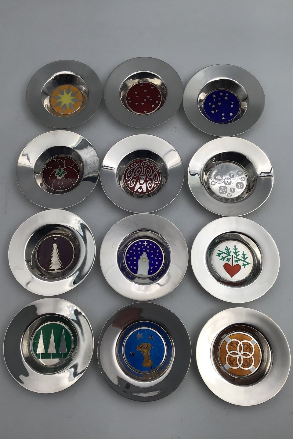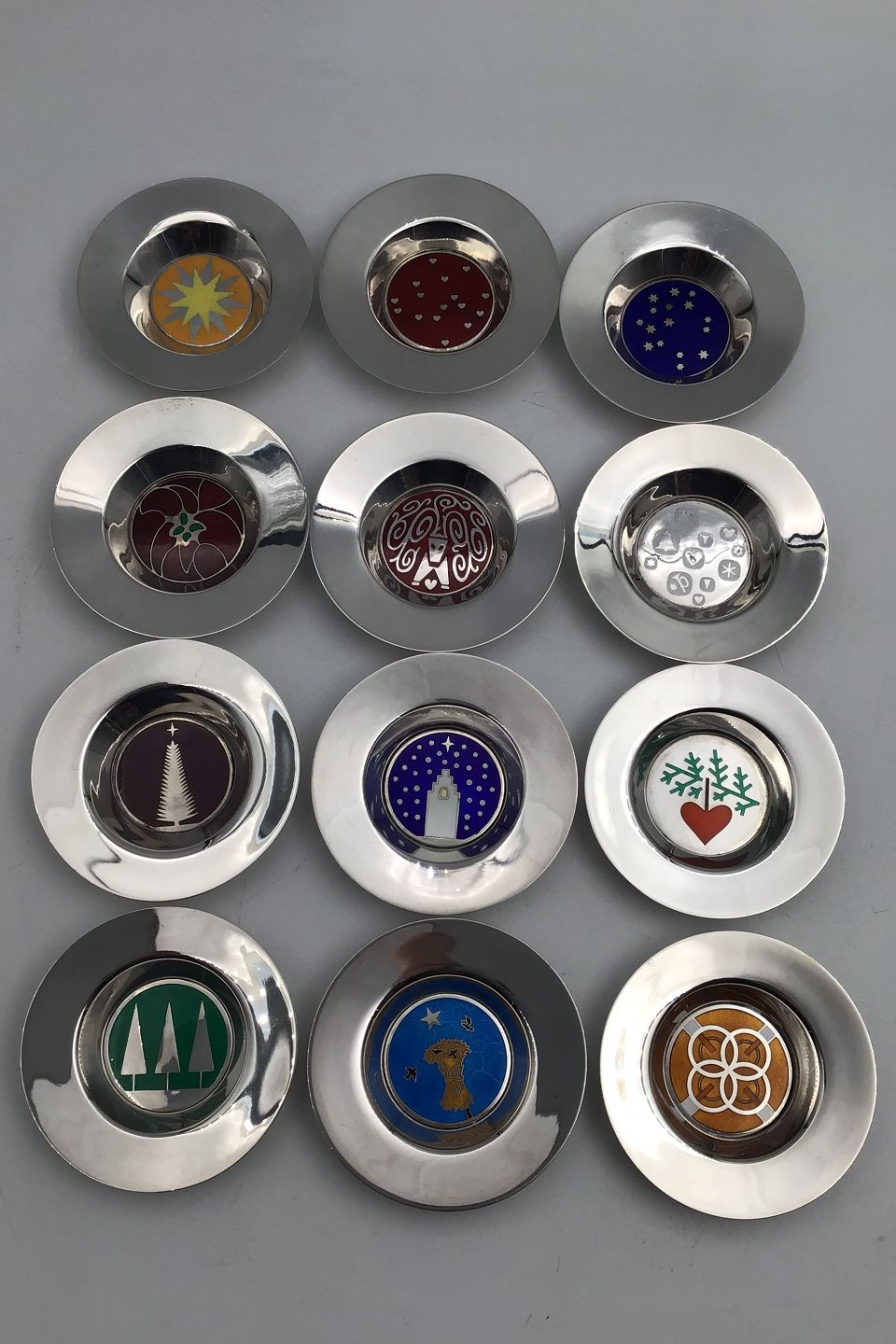 Peter Hertz Sterling Sølv / Emalje Skåle Sæt (12) (1968-1979) Måler Diam 7.5 cm (2.95 inch) H 1 cm (0.39 inch) Samlet Vægt 584 gr. (20.60 oz) (Forskellige Julemotiver)