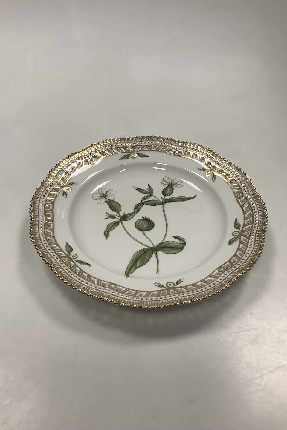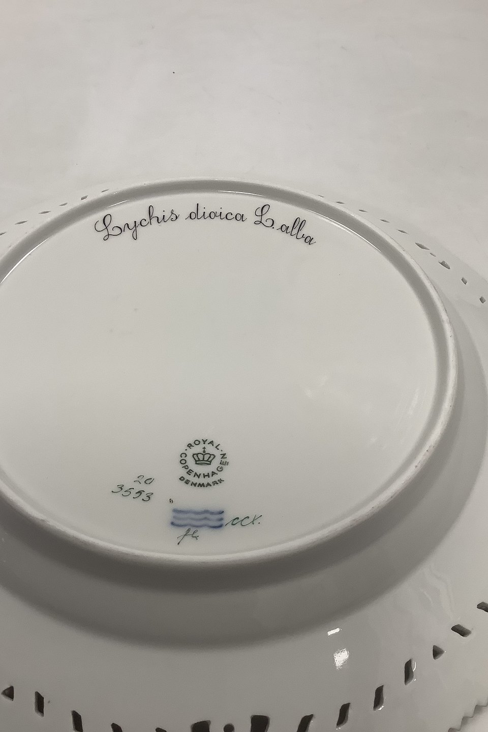 Royal Copenhagen Flora Danica tallerken med gennembrudt kant No 20/3553. Latinsk navn: Lychis dioica L. alba