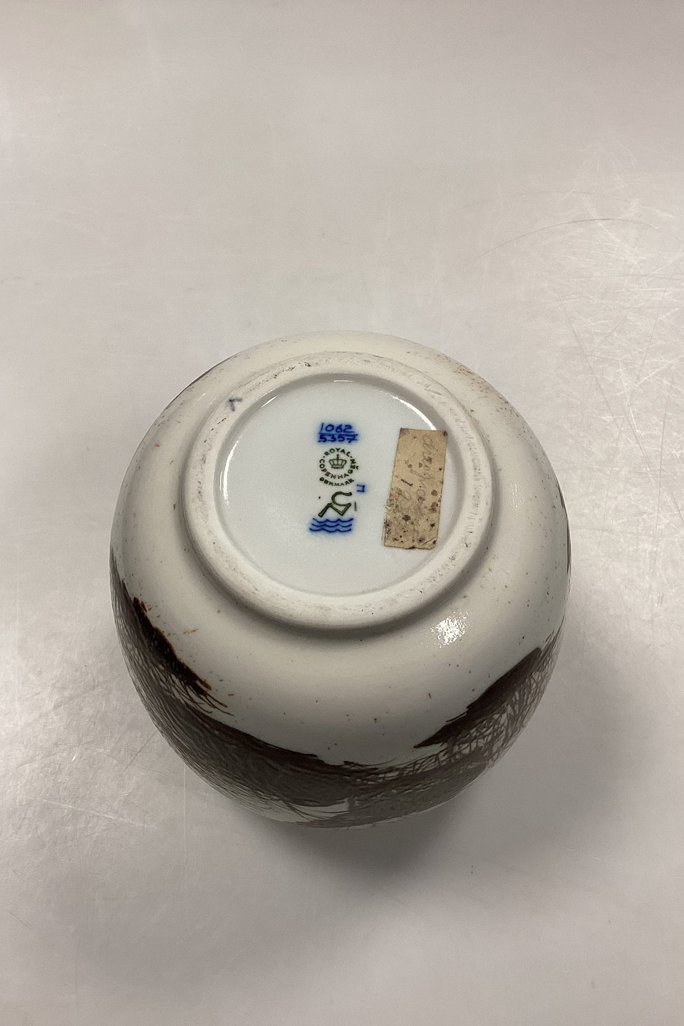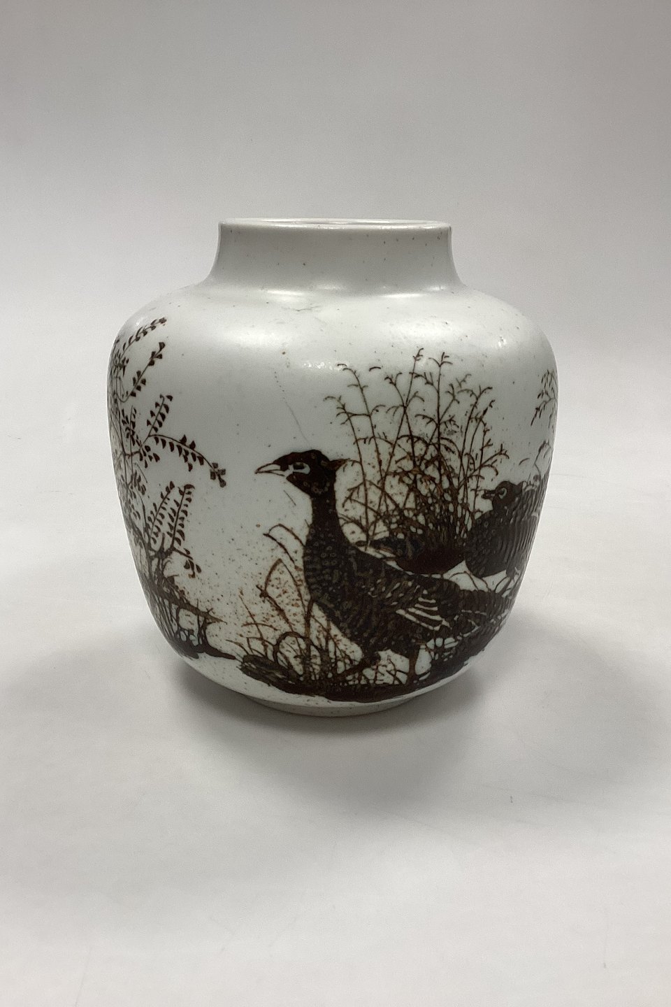 Royal Copenhagen Faience Diana Vase with Pheasants No.1062/5357. Brown motif on white background. Designed by Nils Thorsson. Measures 18 cm x 16 cm / 7.08 in. x 6.29 in. 1st Quality.