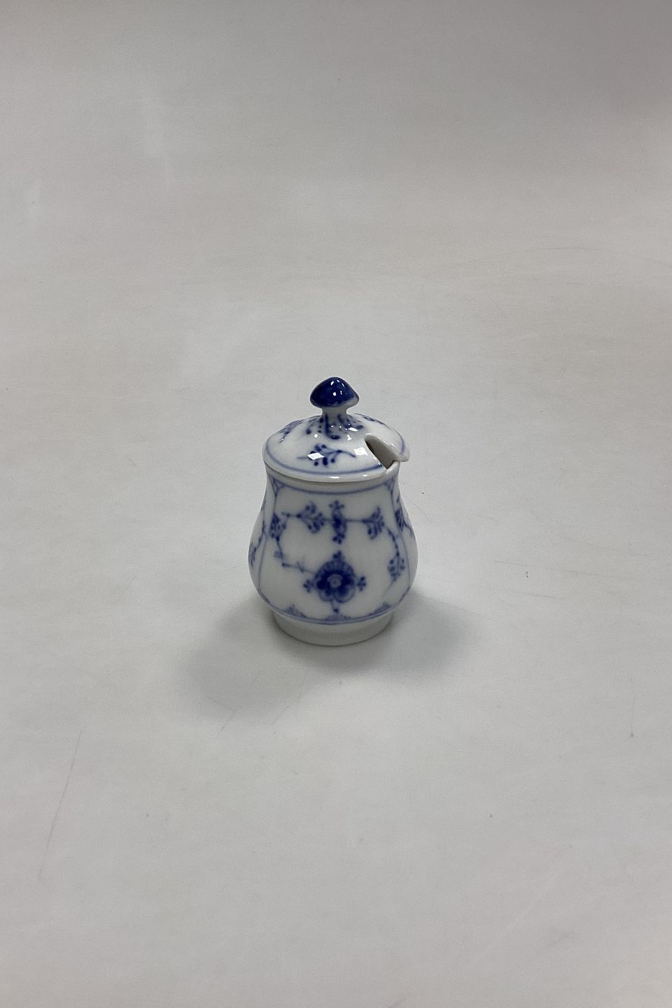 Royal Copenhagen Musselmalet Riflet Lille Sennepskrukke No. 358. Måler 7 cm / 2,75 in. Lille afslag på låget, se foto.