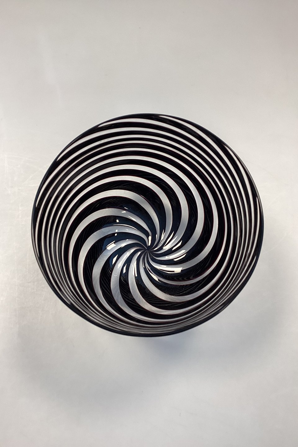 Glass Bowl by Peter Svarrer in black and white stripes. Signed at the bottom. Measures 16.5 cm x 22 cm / 6.5 in. x 8.66 in.