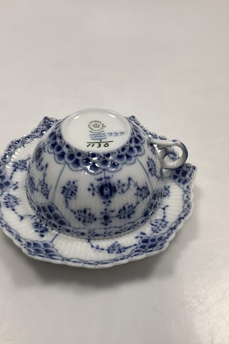 Royal Copenhagen Musselmalet Helblonde Tekop med Underkop No 1130. Måler 10cm. I fin hel stand. 1. Sortering