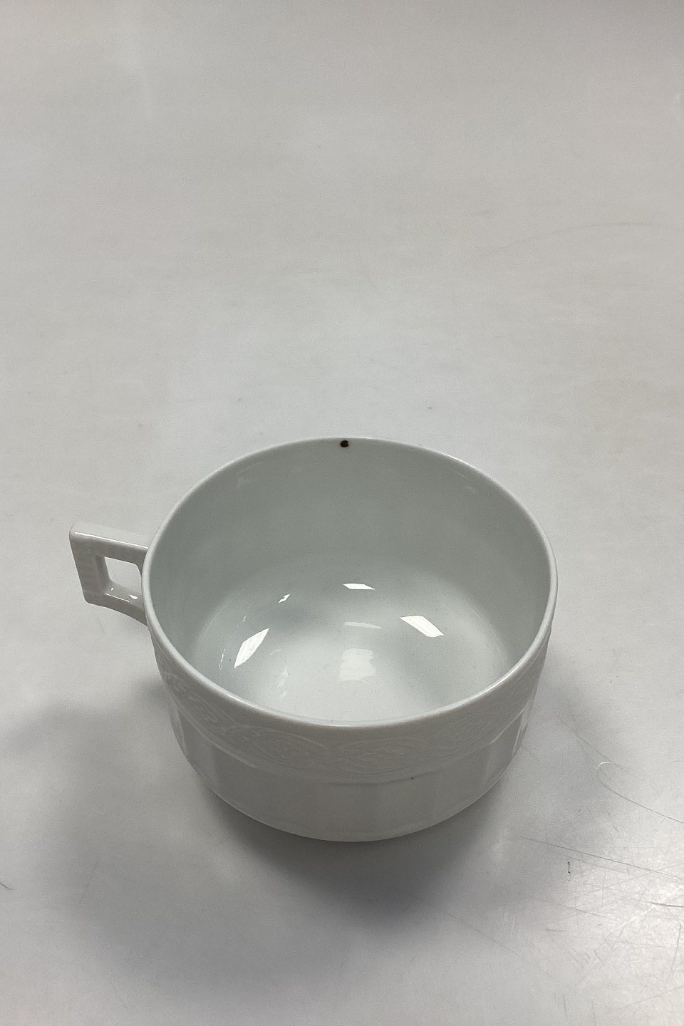 Royal Copenhagen Hvid Vifte Tekop med Underkop No. 84/11554. Kop: 6.5 cm x 10 cm / 2.55 in. x 3.93 in. Underkop: 17 cm / 6.69 in.