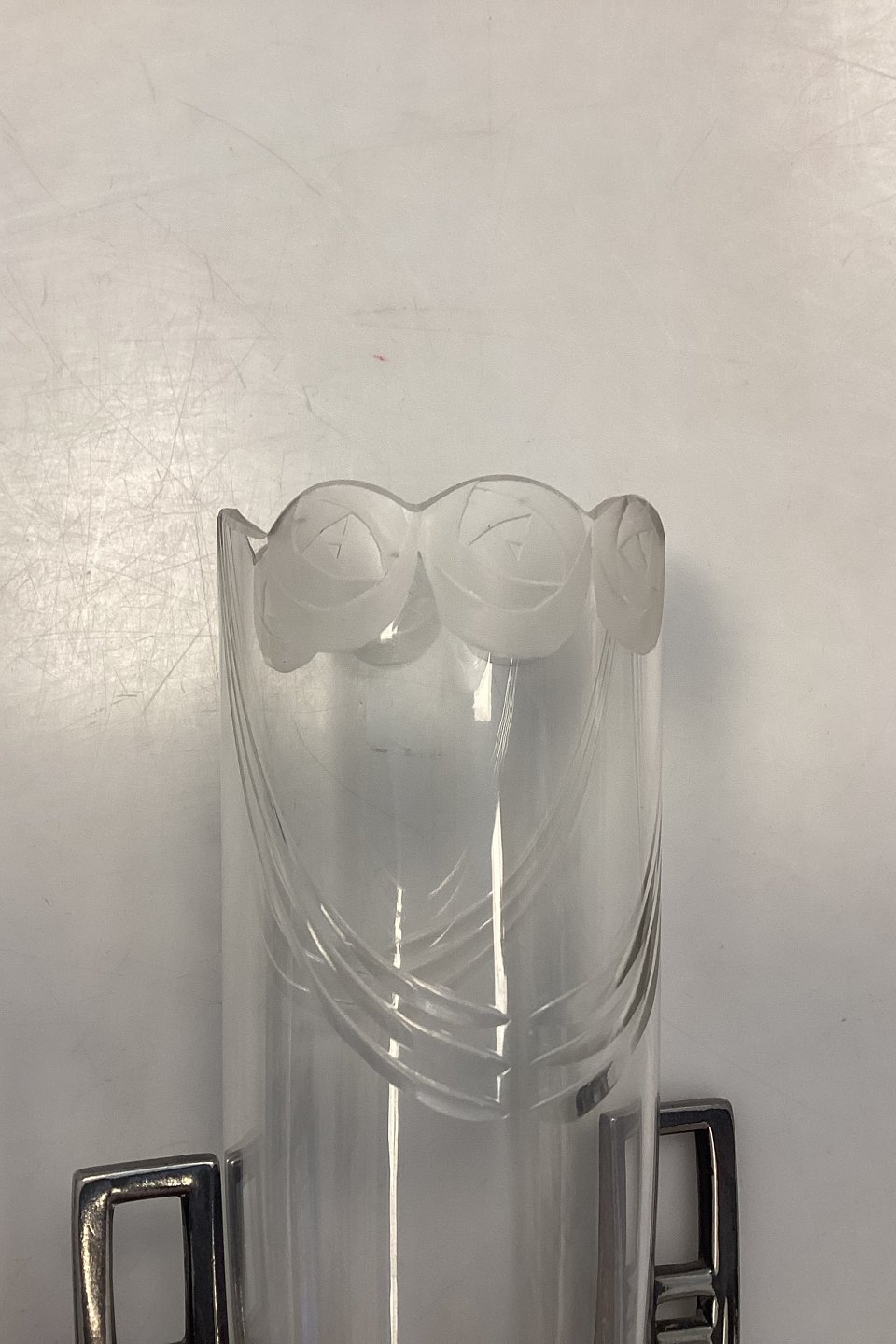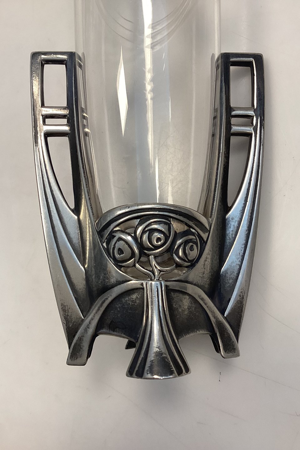 WMF Art Nouveau Vase No. 115 A. Fabrikeret i Tyskland omkring år 1900 af Württembergische Metallwarenfabrik. Glasvase med facetslebne guirlander og matslebne roser øverst i kanten. Glasholderen er lavet i oxideret tin, og ligeledes dekoreret med roser. I meget fin stand.