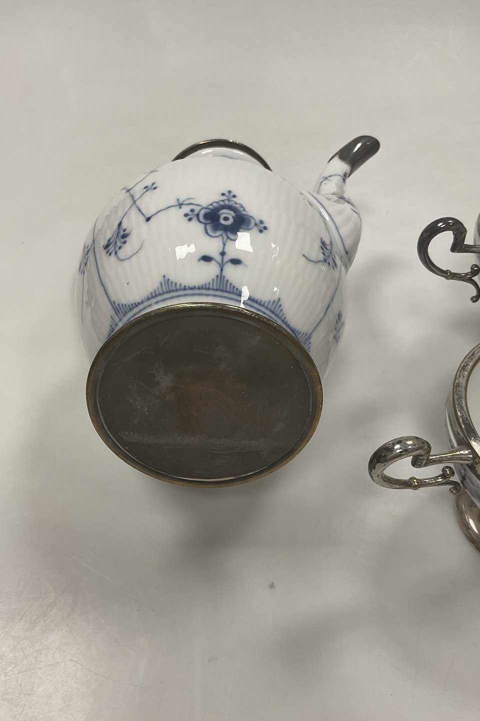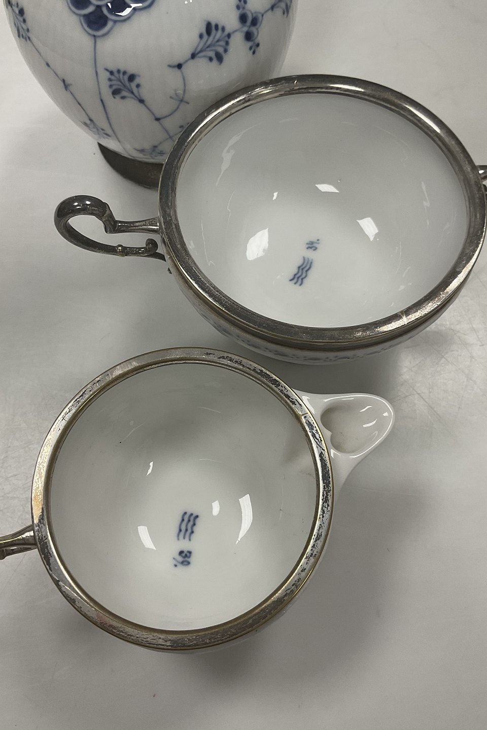 Royal Copenhagen Halvblonde Kaffekande, flødekande og sukkerskål med metal montering