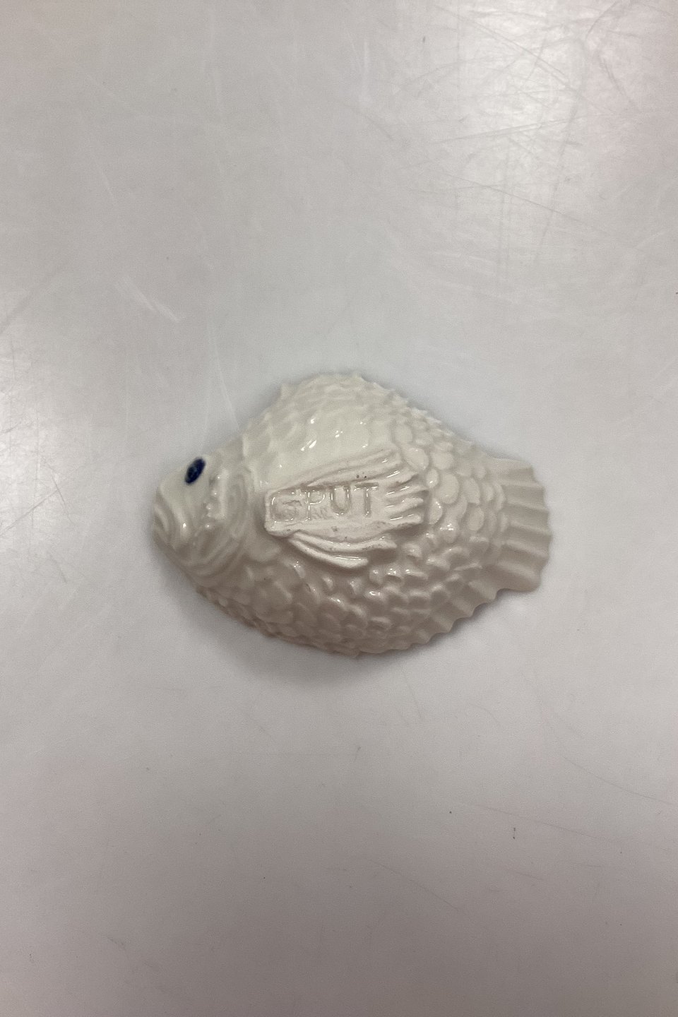Royal Copenhagen Skål - Lille Fisk af Jeanne Grut. Hvidt stentøj med mørkeblå øjne. Signeret GRUT.