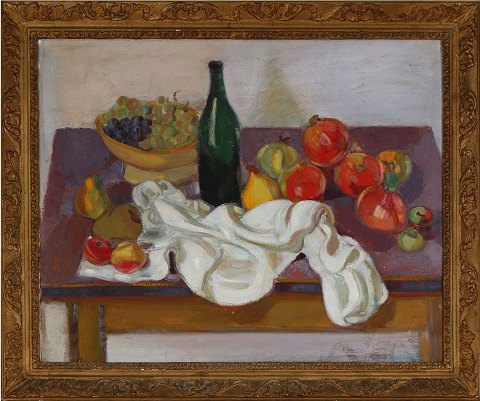 "Opstilling med klæde, frugter og flaske på bord" Maleriet bærer nogle krakkeleringer, lærredet bliver sikkert dubleret. Olie på lærred.