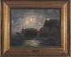 "Sydlandsk havneparti i måneskin" Olie maleri på plade.