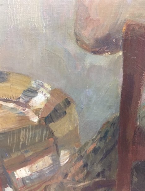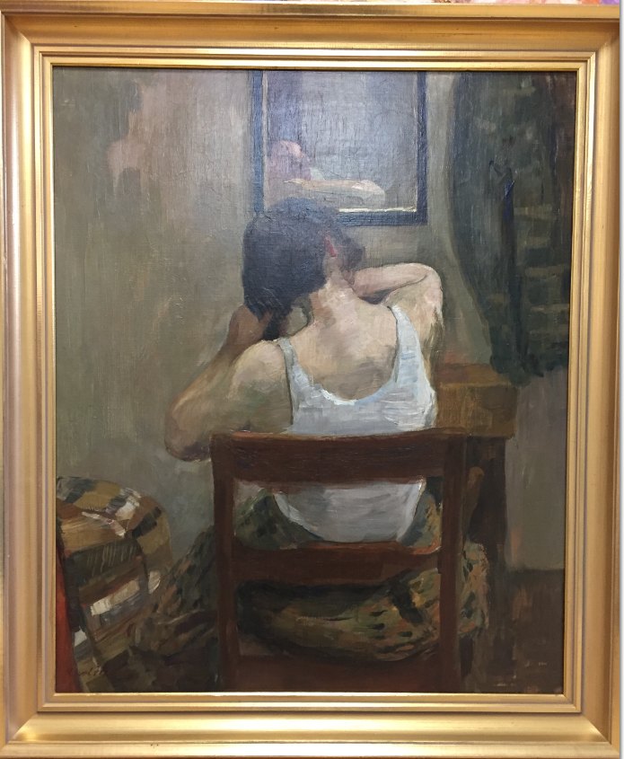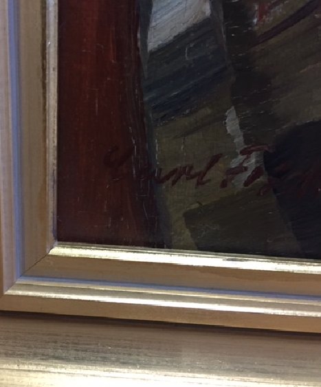 "Interior with the artist's wife" Oil painting on canvas, mounted on plate.