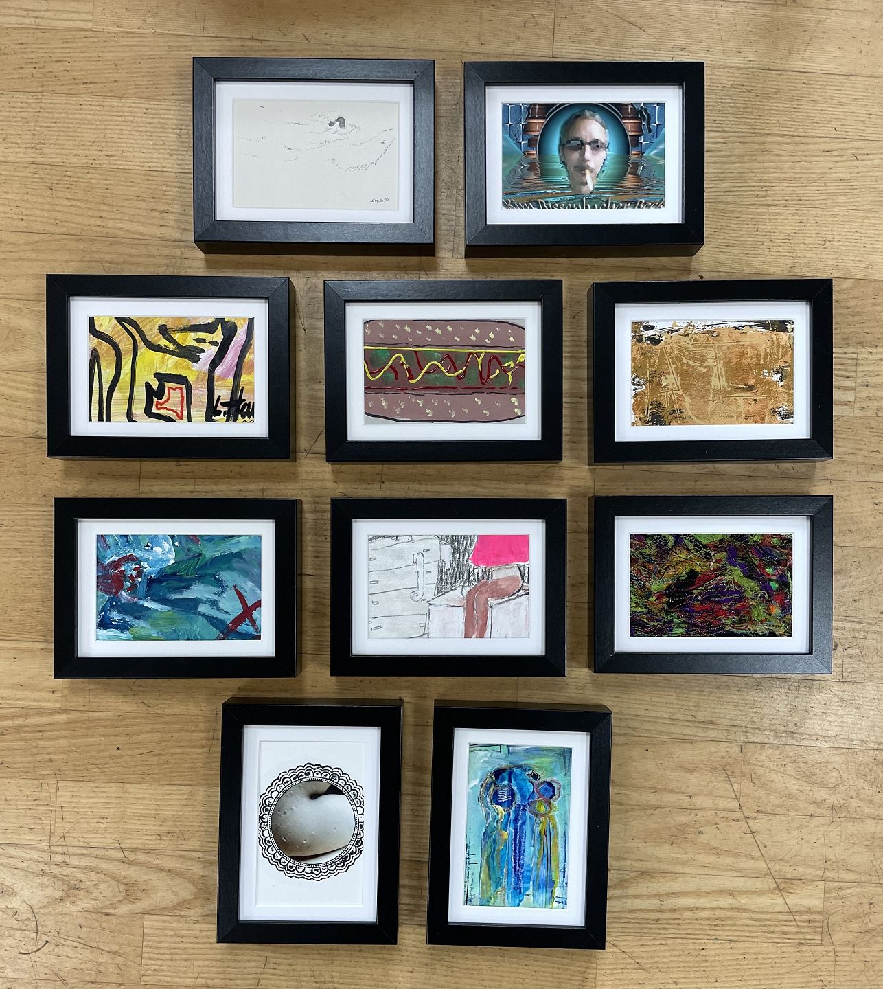 Ca. 100 stk. små unika kunstværker inkl. sort ramme med Passe Partoit, en oplagt julegave.