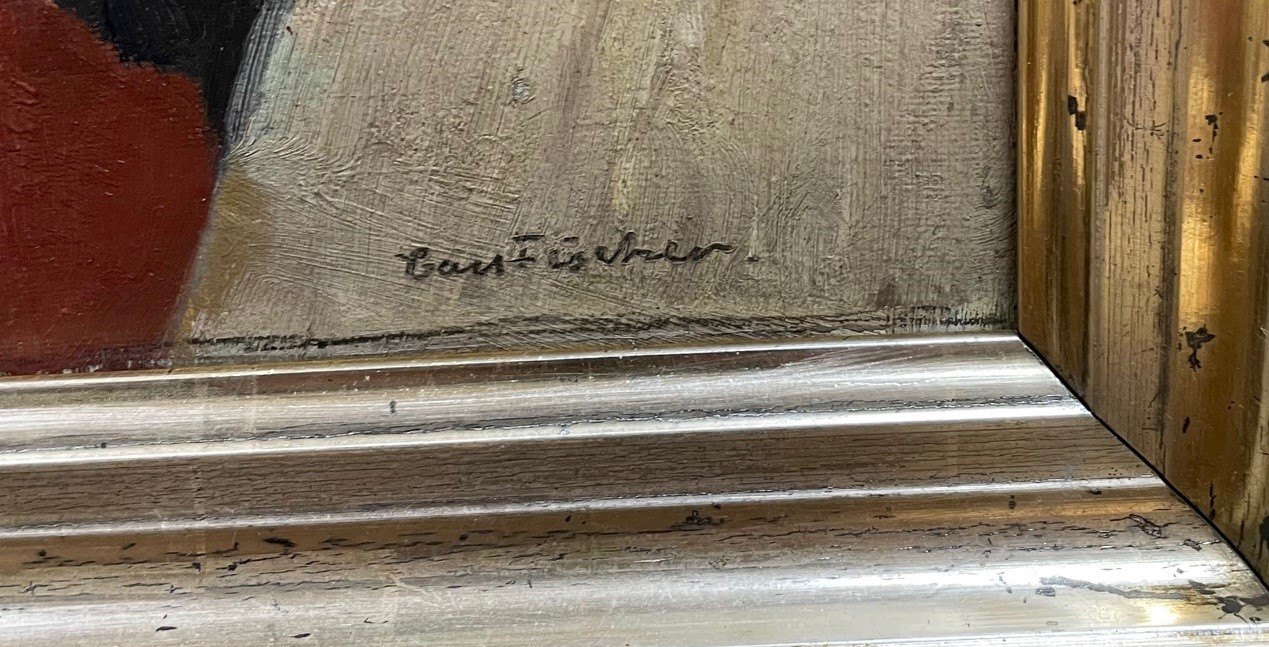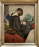 "Interior with young woman" Oil painting on canvas in silver frame.