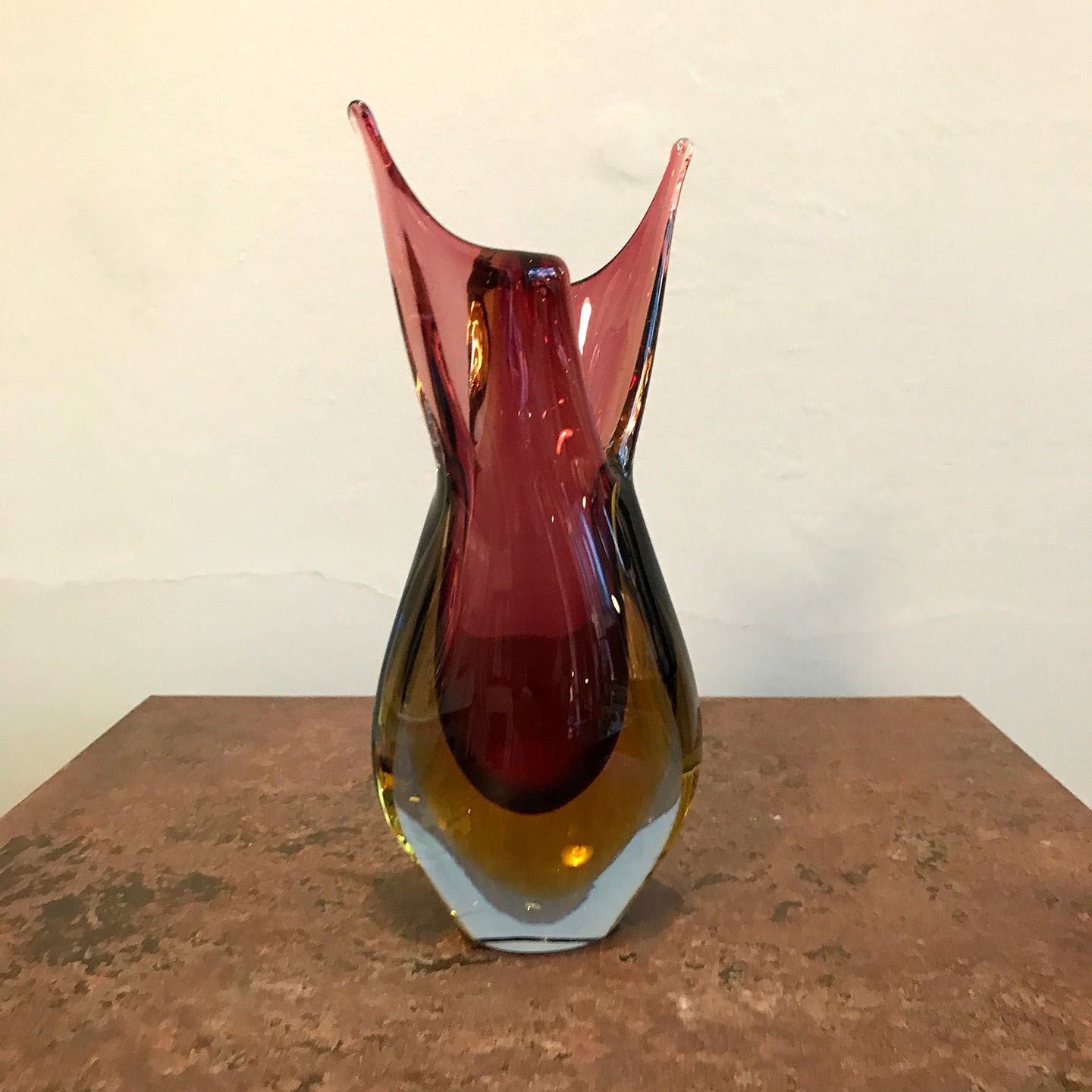 Murano Sommerso. A Venetian organic glass vase of clear, reddish purple and yellow glass. Performed on the island of Murano, near Venice, Italy. Made in the style of Flavio Polis summer glassware for Seguso Vetri d'Arte.H. 22.5 cm. B. 9 cm. D. 5 cm.
