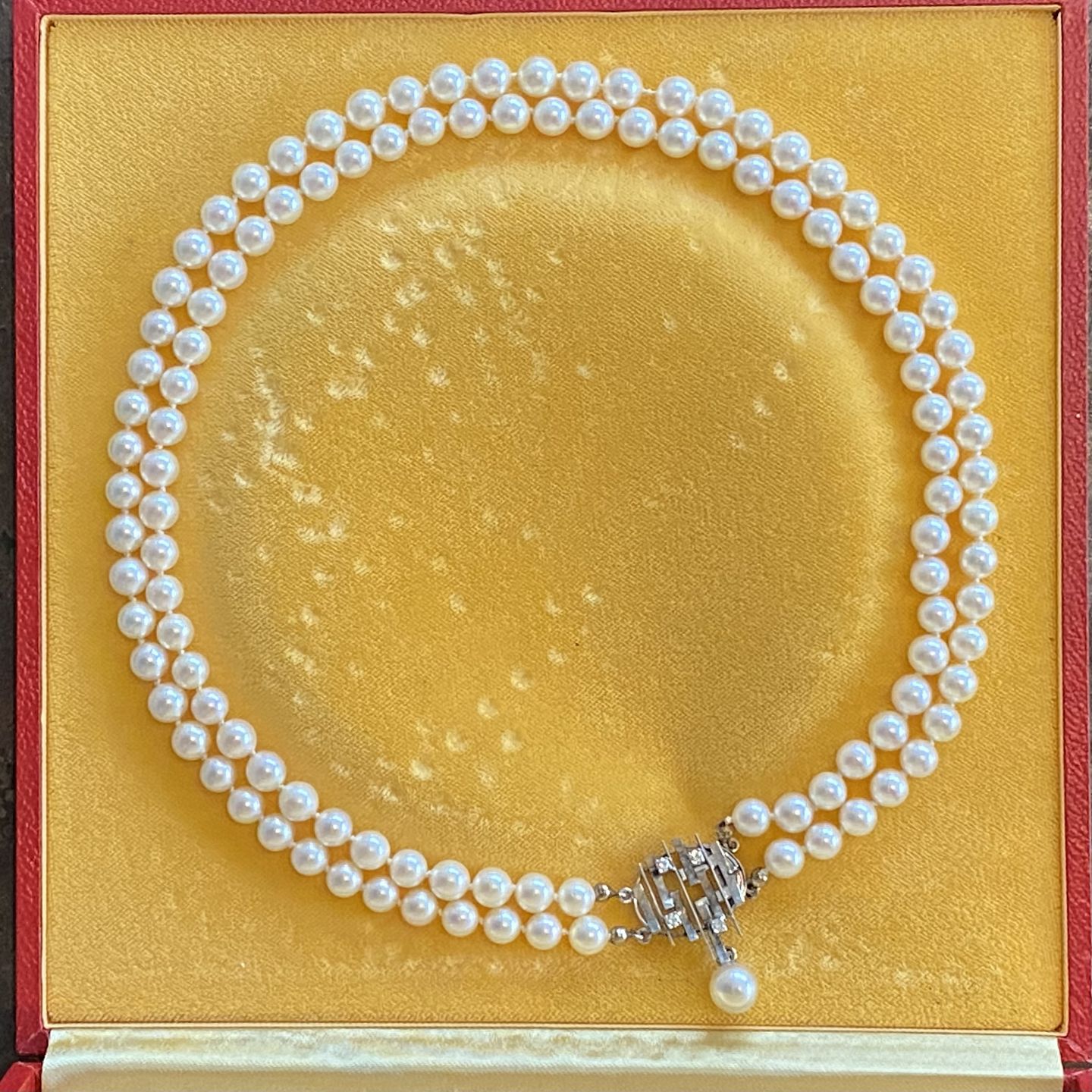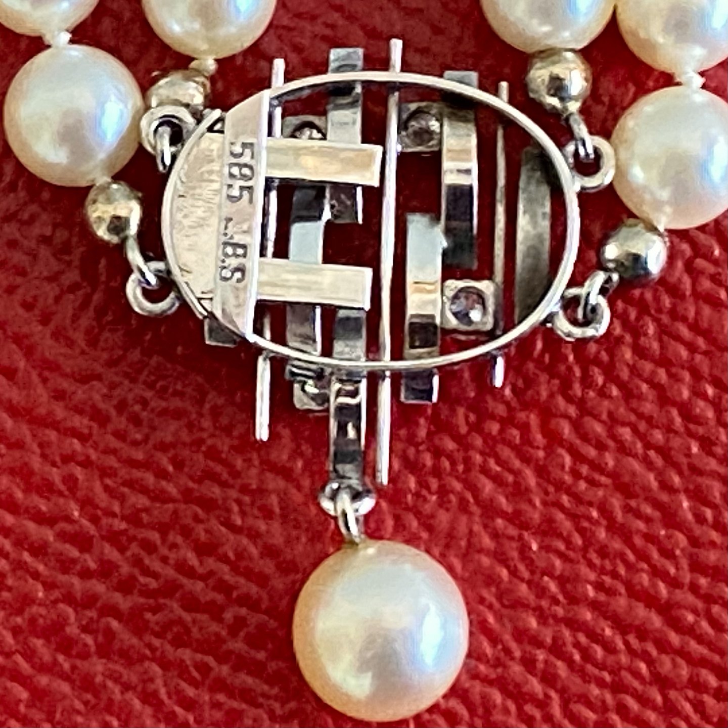 Halskæde med 126 på Ø 6 mm. kulturperler i forløb. Større perle på vedhæng af 14k hvidguld med 4 små brillanter på hver 0,3k.