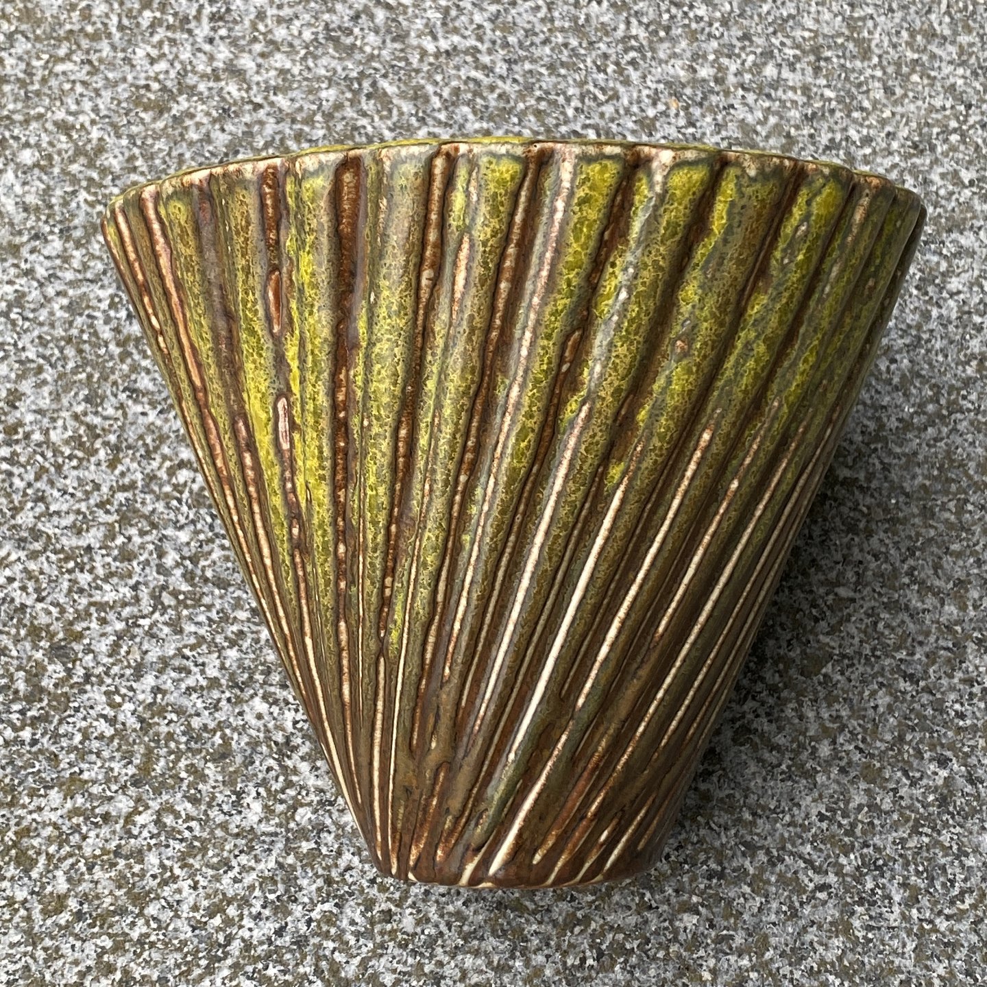 Vase i stentøj med kanneleret og snoet, konisk korpus med solfatare-glasur. Fin stand.