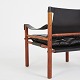 Pair of safari chairs by Arne Norell, model 'Sirocco'. Frame of solid stained ash wood. Back, seat and armrests of stretched black leather. Loose cushions covered with button-stitched black leather. Price for 2 chairs.