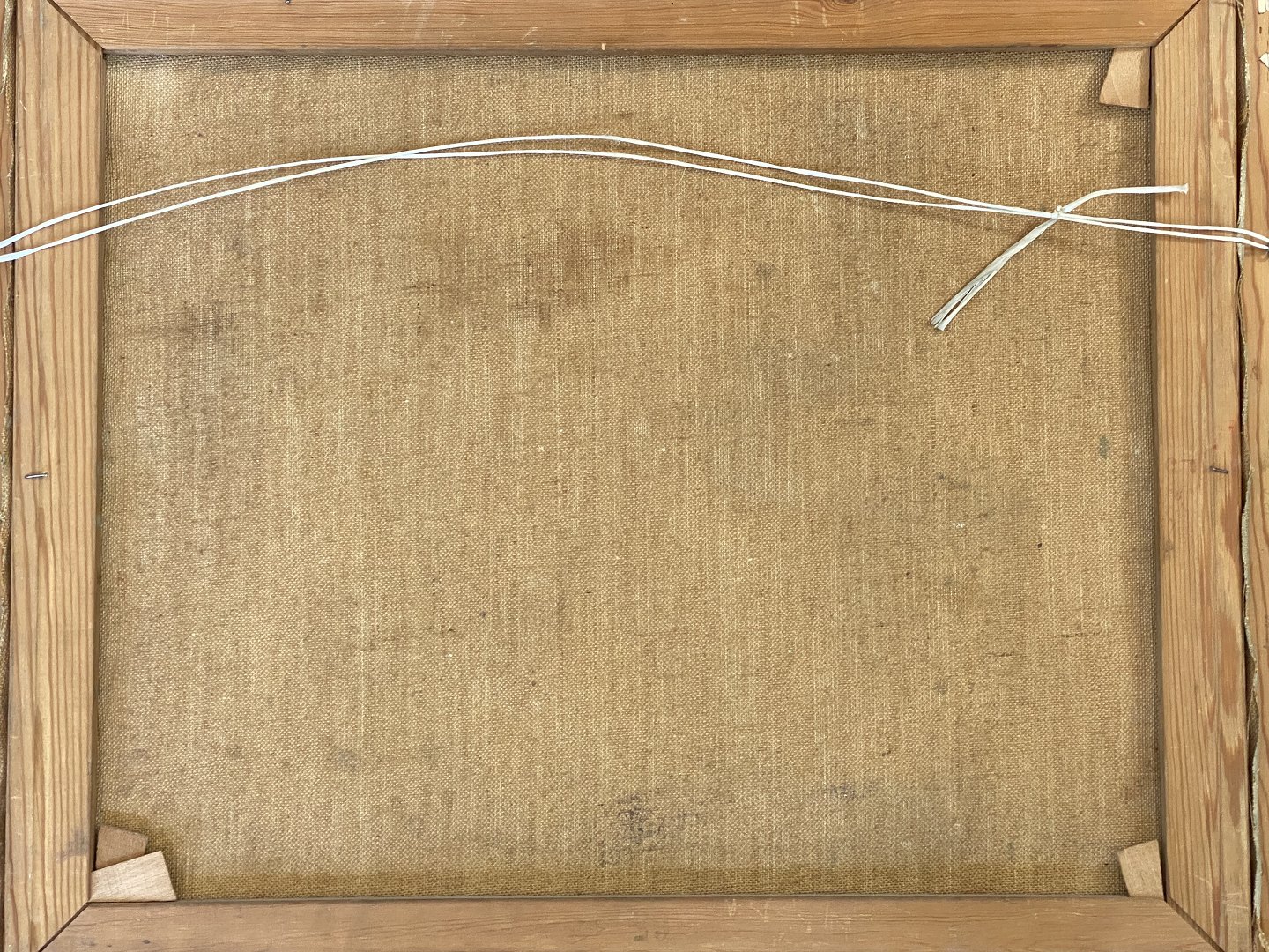 Oliemaleri i guldramme. Motiv sommer med familie i have.