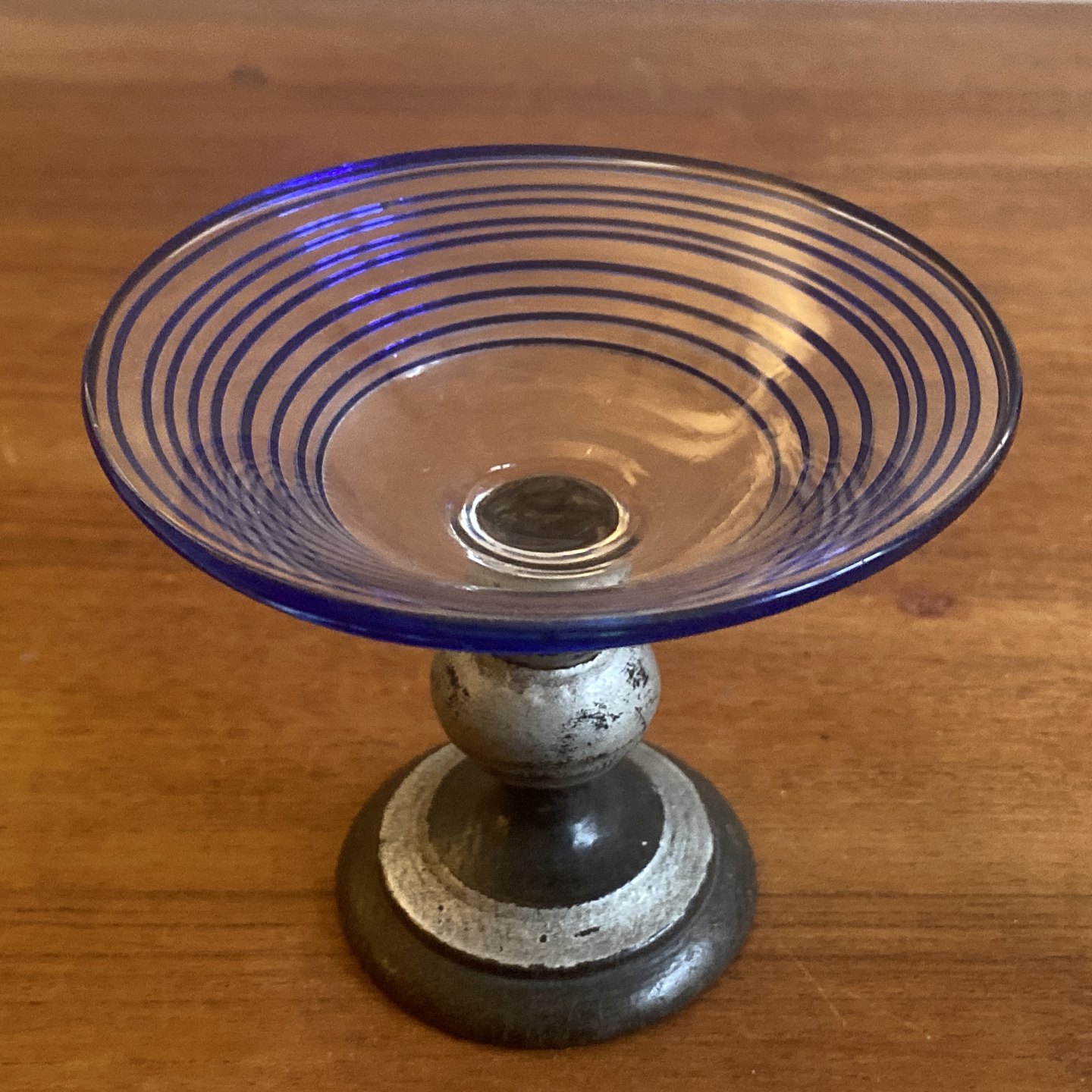 Itemnumber: 603894Sugar bowl of clear glass with a blue spiral around it. circa 1860. Painted stem and foot. Half of the stem is made of glass, the last part of the stem and foot is made of wood. H. 9.7 cm. Diameter 11.2 cm.