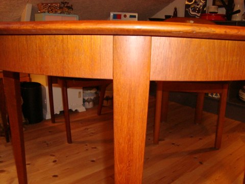 Pæn og velholdt teak spisebord m. 2 tillægsplader, H. 73 cm D. 115 cm