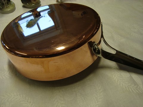 Stor sautepande i kobber D. 25 cm H. 7,5 cm, stegepande D. 27 cm H 4 cm fremstillet af Georg Jensen. I fin Stand. Pris kr. 775 og kr. 375.