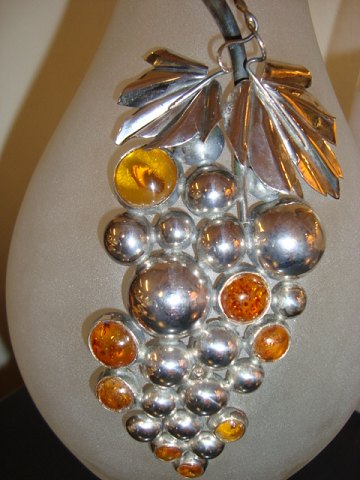 Unika karaffel m. prop og 2 glas med dekoration af Sterling sølv og indlagt rav. Designermærke G/D. Højde karaffel 27 cm, højde glas 16,5 cm