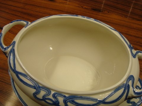 Blå Olga Terrin med underfad fra Villeroy & Boch i super flot stand. L. 37 cm, B. 28 cm, H. 22 cm.