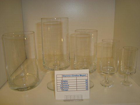 Stamme, designet af Grethe Meyer og Ibi Trier Mørch. 1958 - 1973. 5 Ølglas kr. 50 9 Rødvin kr. 85 17 Hvidvin kr. 75 16 Portvin kr. 35 7 Snaps kr. 25