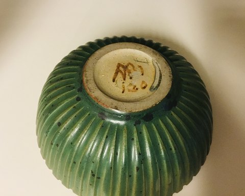 Arne Bang skål af stentøj med sølvplet låg, modelleret med riflet korpus, dekoreret m. grønlig fugleæg-glasur H 4,7 D 12,0