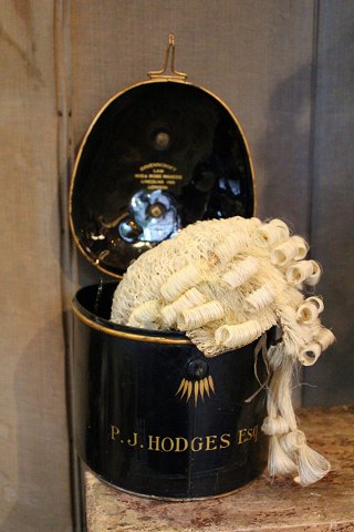 Antique, decorative English 1800s judge wig in horse hair with fine original metal box.