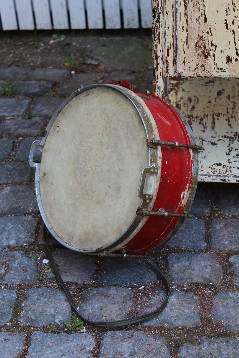 Decorative old drum with fine patina. H: 15 cm. Dia.: 35 cm.