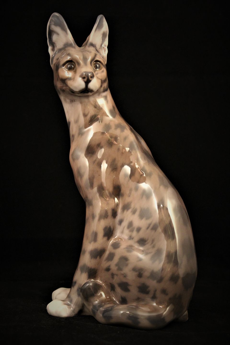 Sjælden porcelæns figur af en Serval fra Dahl Jensen - Danmark. ( DJ ) 2.sort. Højde:25,5cm.