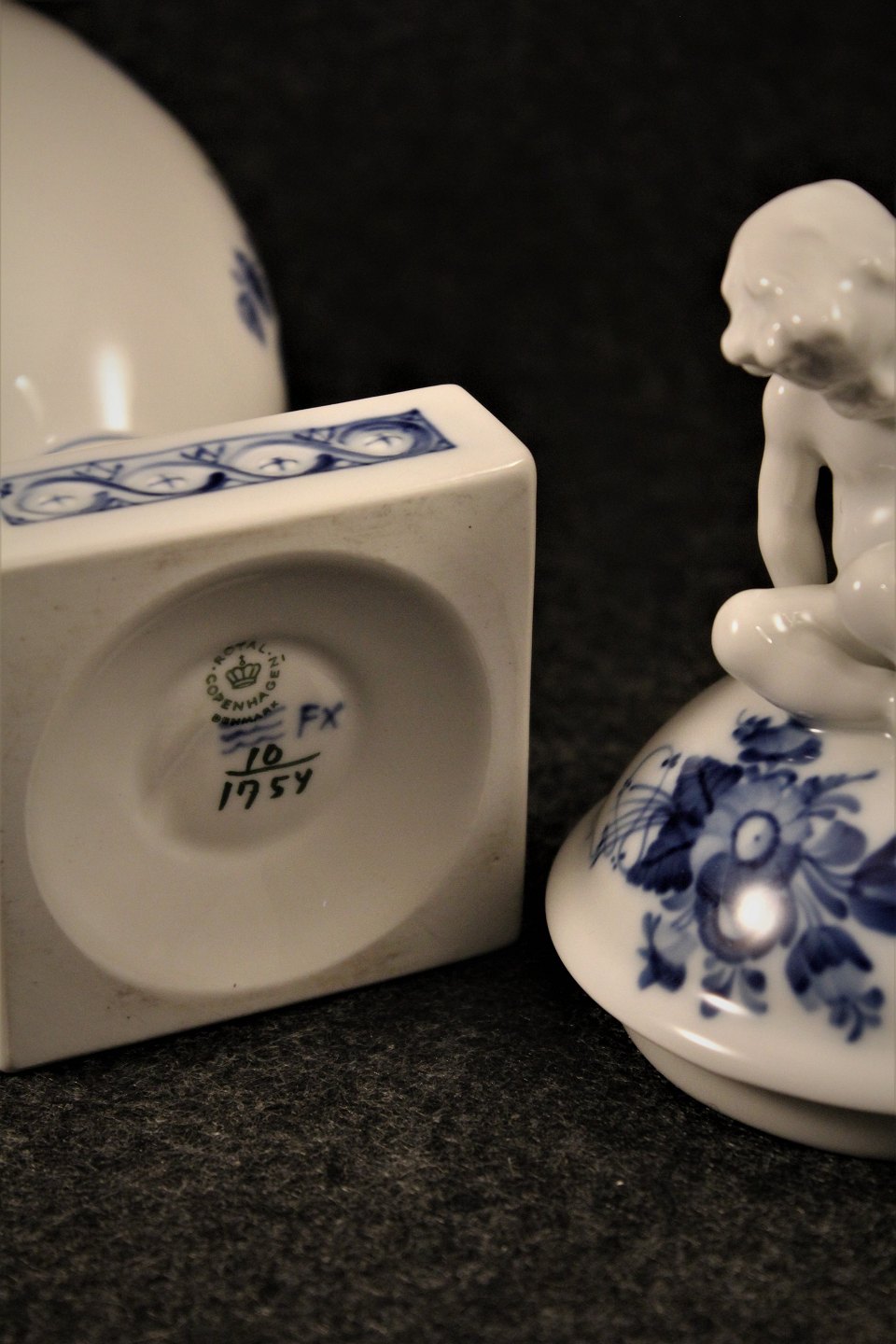 Blue Flower egg vase / cup vase from Royal Copenhagen with little boy on the lid. Decoration number: 10/1754. Factory 1st quality. Height: 29,5cm. Dia.:10,5cm.