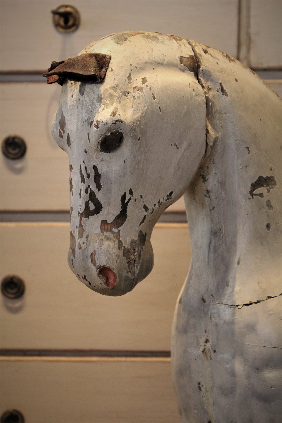 Decorative, large old Swedish horse in carved wood from the 1800s with white color, a really nice patina, glass eyes, leather ear and tail in real horse hair.