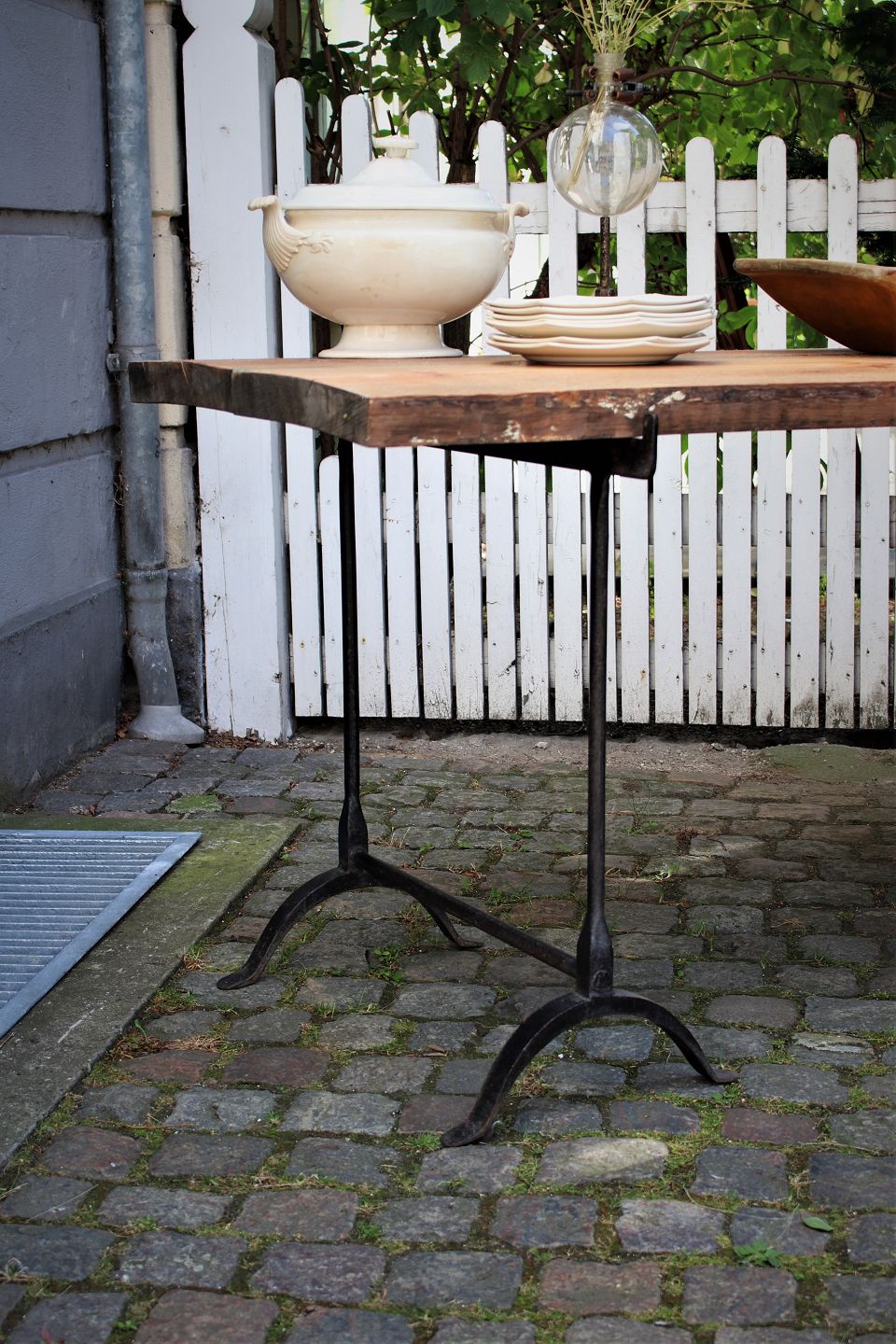 French long table / plank table, consisting of 2 old wrought iron trestles with thick wooden planks with a fine patina....