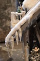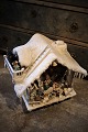 Decorative German Christmas house with many fine details, Snow on the roof with hanging icicles made of cotton wool and lots of small Christmas figures.