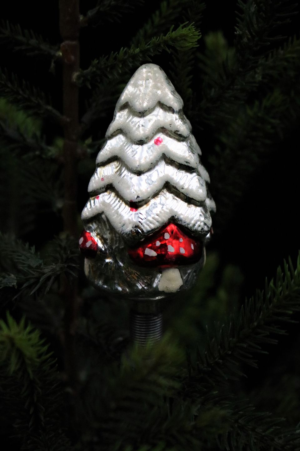 Rare old glass Christmas ornament / Christmas tree decoration in the form of a Christmas tree with little Santa Claus and red mushrooms.