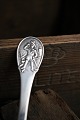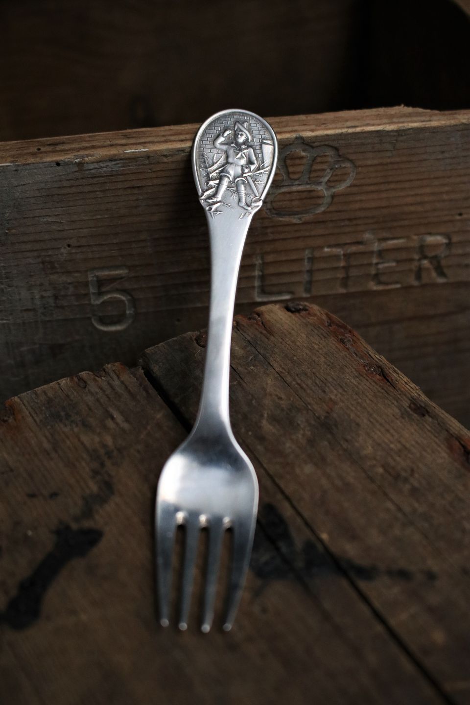 Old children's fork in silver with boy with hat and sword. (Stamped) L:14.3cm. (without engraving) Item number: Barnegaffel i sølv med dreng