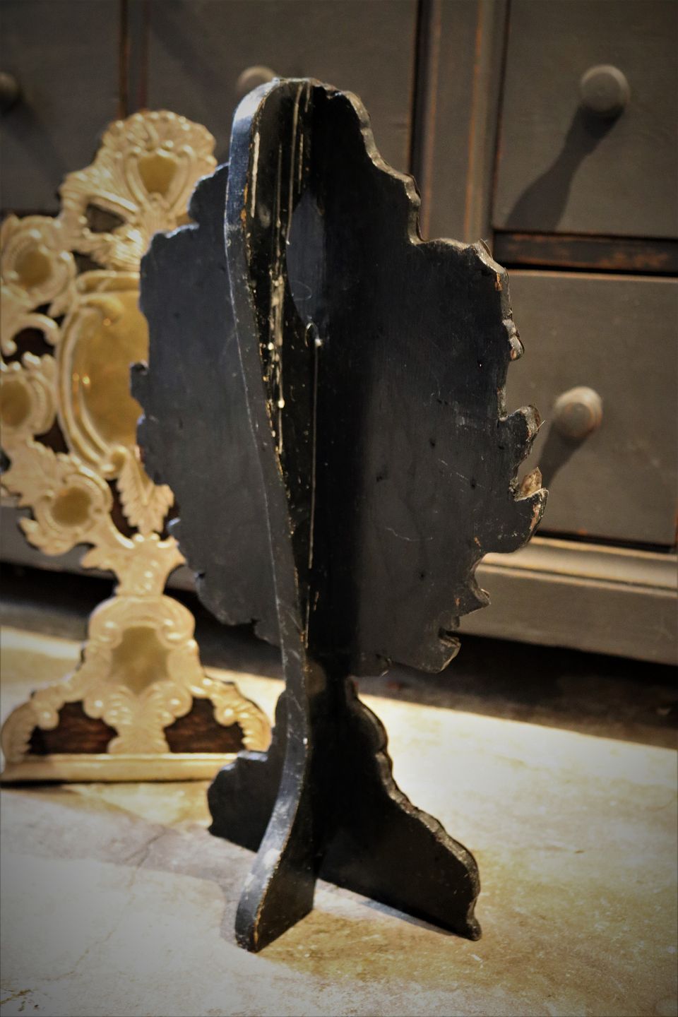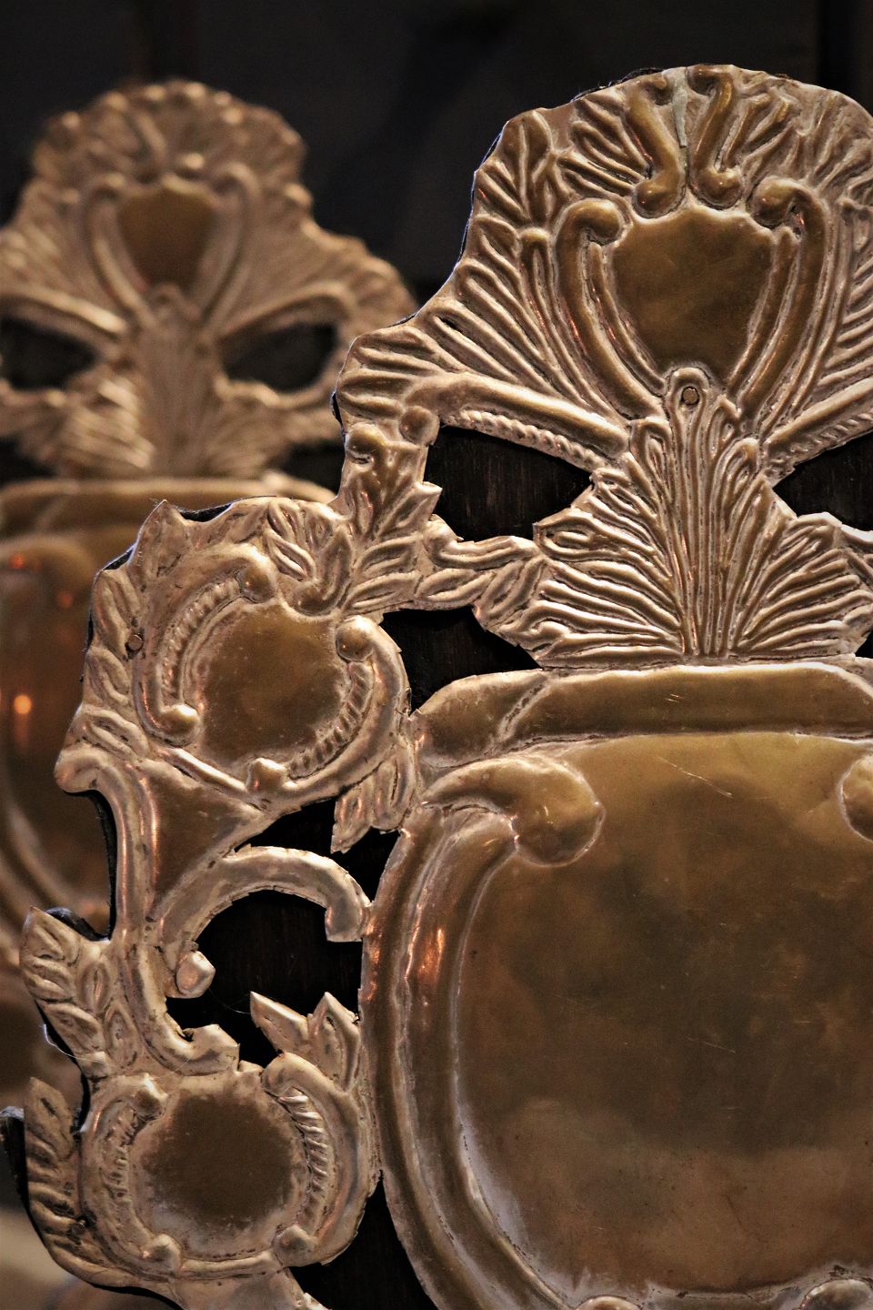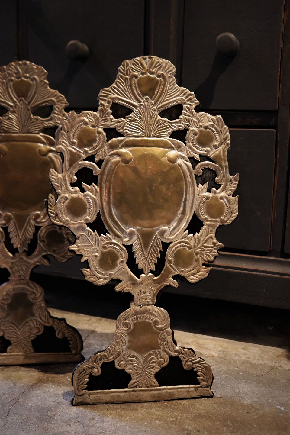 A pair of decorative French 19th-century black-painted wooden stands finely decorated with brass ornaments with remnants of old varnishing. The wooden decorations originate from a church where they stood on the altar as a background for a candle and reflected the light.