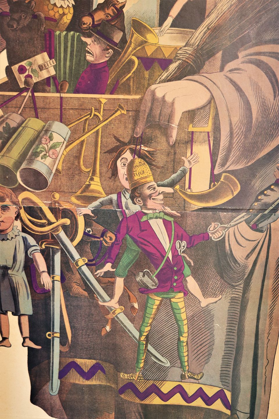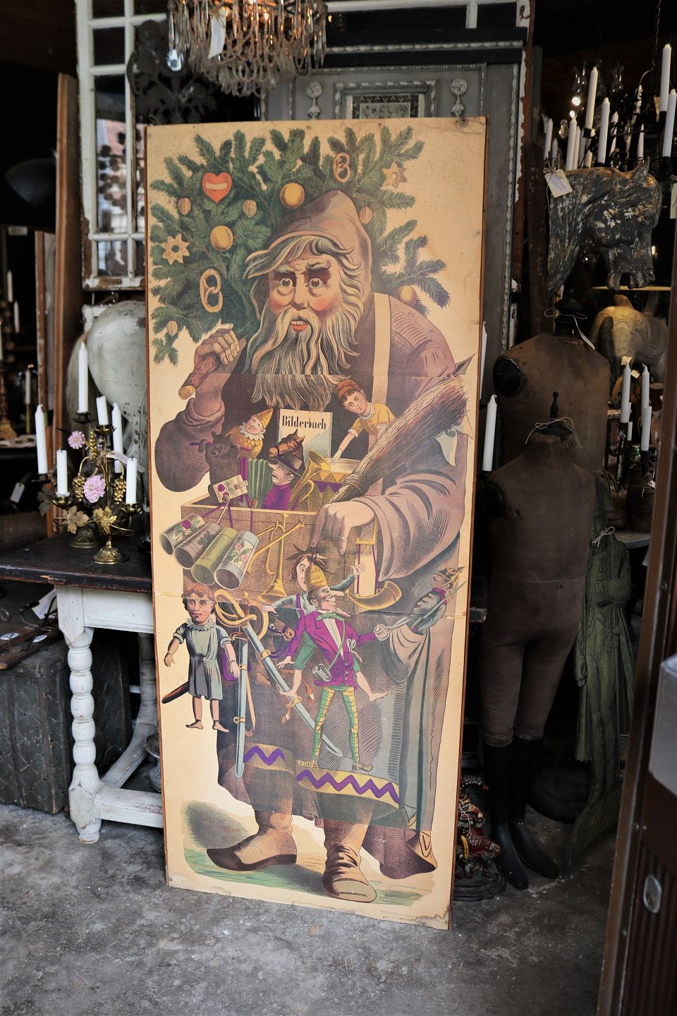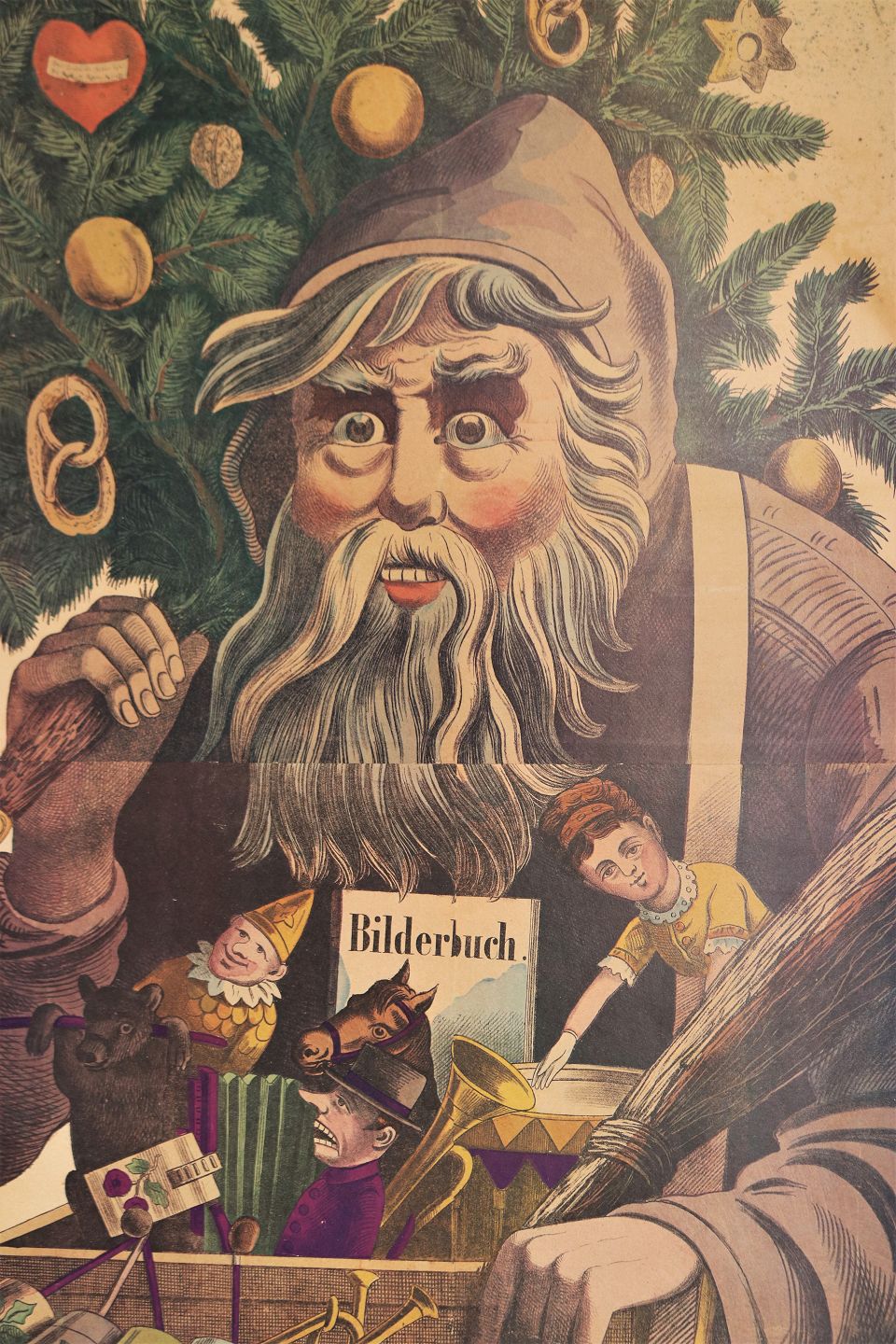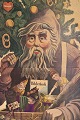 Decorative, old Christmas board (wallpaper on cardboard and wooden frame) with Santa motif with sack and Christmas presents.
