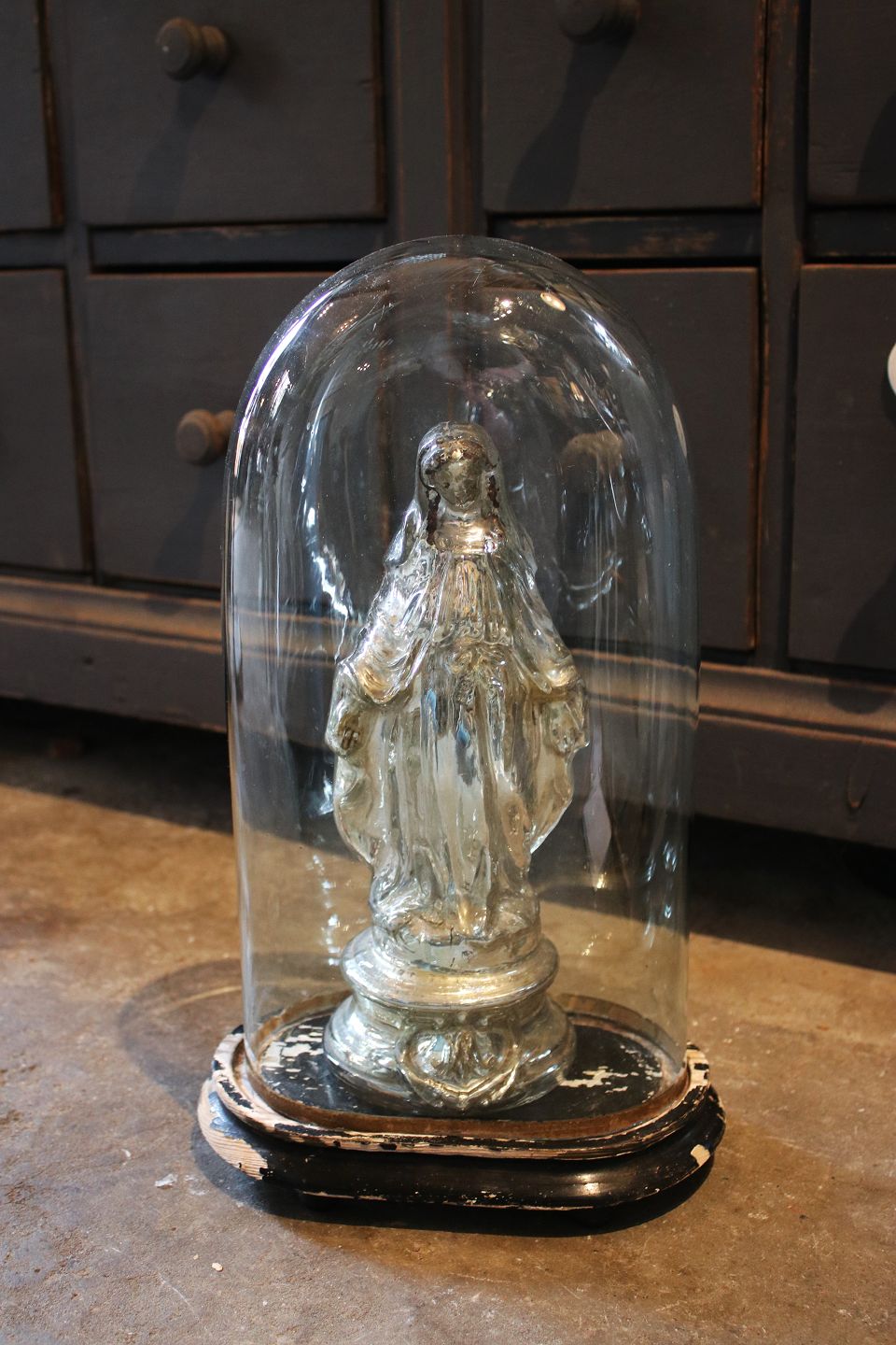 Decorative, old oval French glass Dome / Globe on a black wooden base for exhibition. Total H: 41cm. Base: 24x15cm.