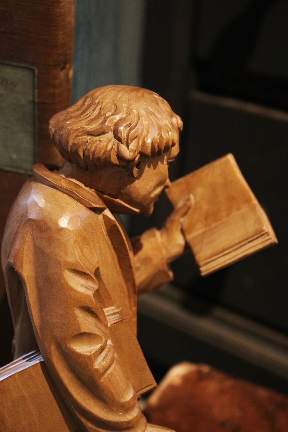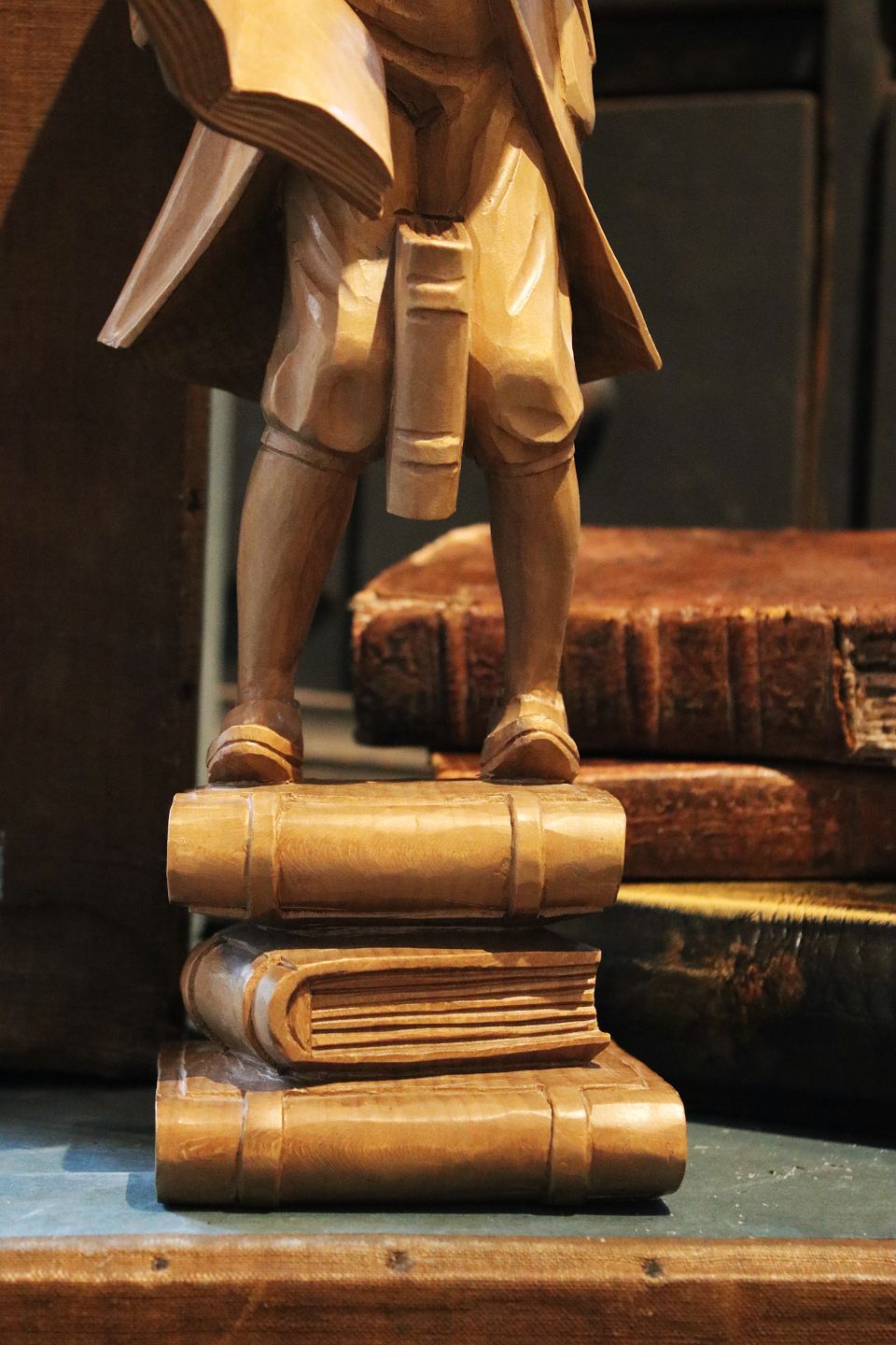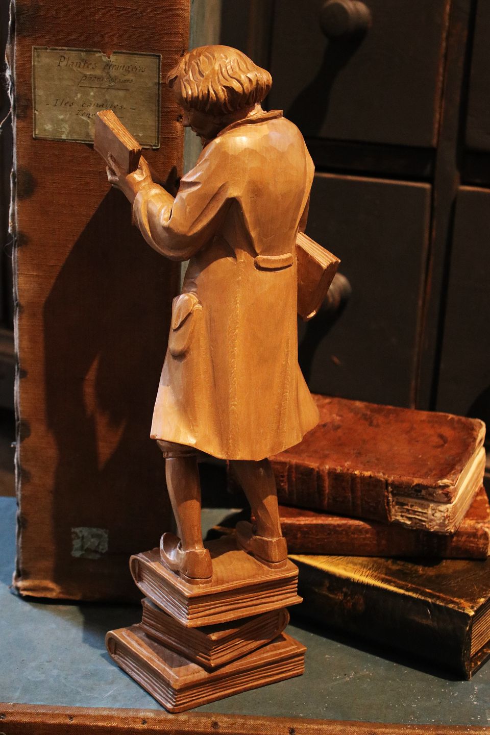 Old figure in carved wood of a real "Bookworm", a man who stands engrossed and holds a lot of books...