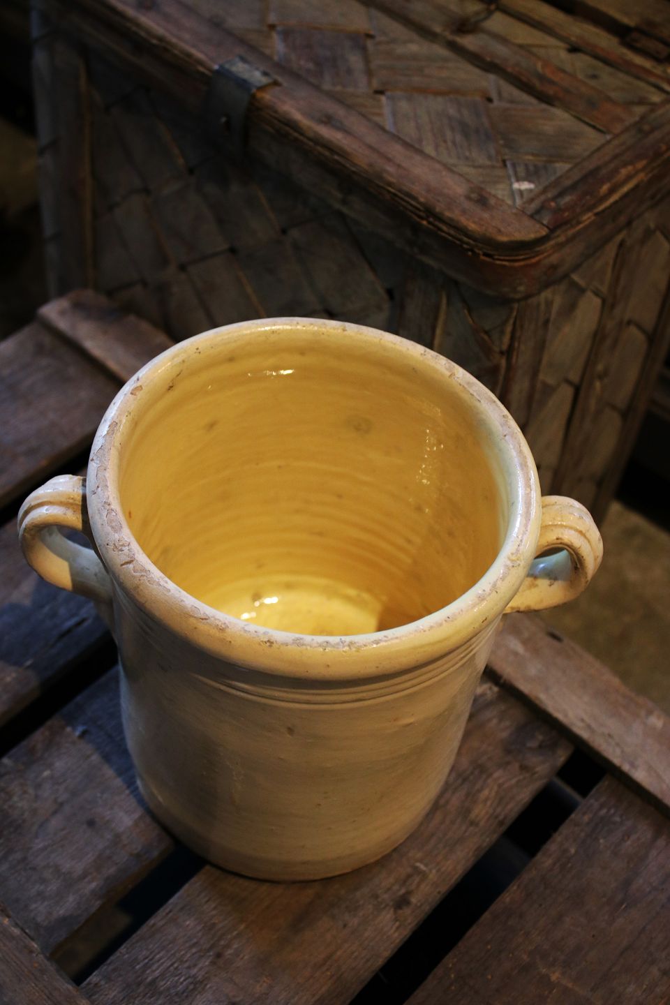Old French glazed ceramic jar with handle and fine cream-colored glaze with a very fine patina. H: 22.5 cm. Dia.: 18cm.