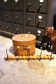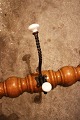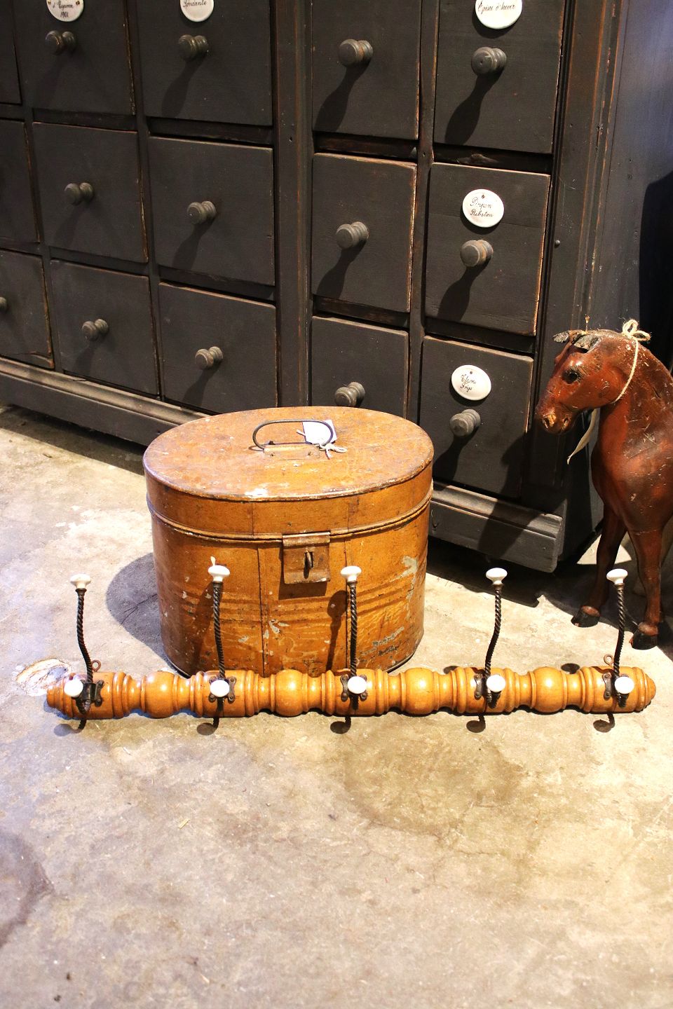 Nice old French wooden coat rack with 5 wrought iron hooks with porcelain knobs. L: 79cm.