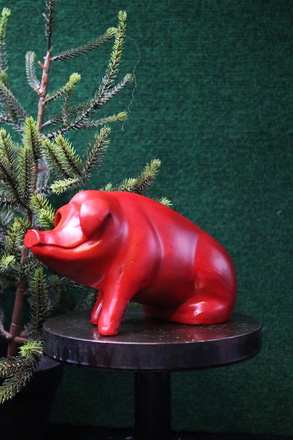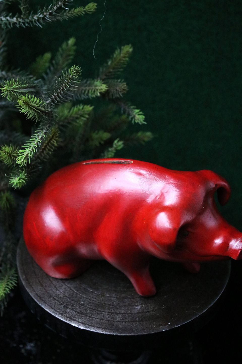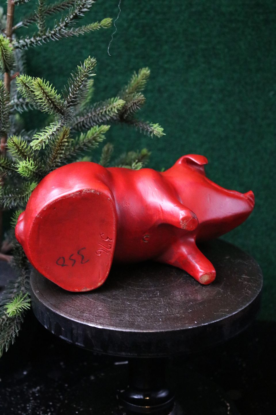 Dekorativ , gammel sparegris i rødmalet terrakotta fra 40érne med en fin patina. H: 10,5cm. L: 20cm. Emne nummer: Sparegris