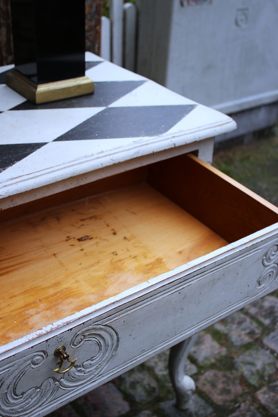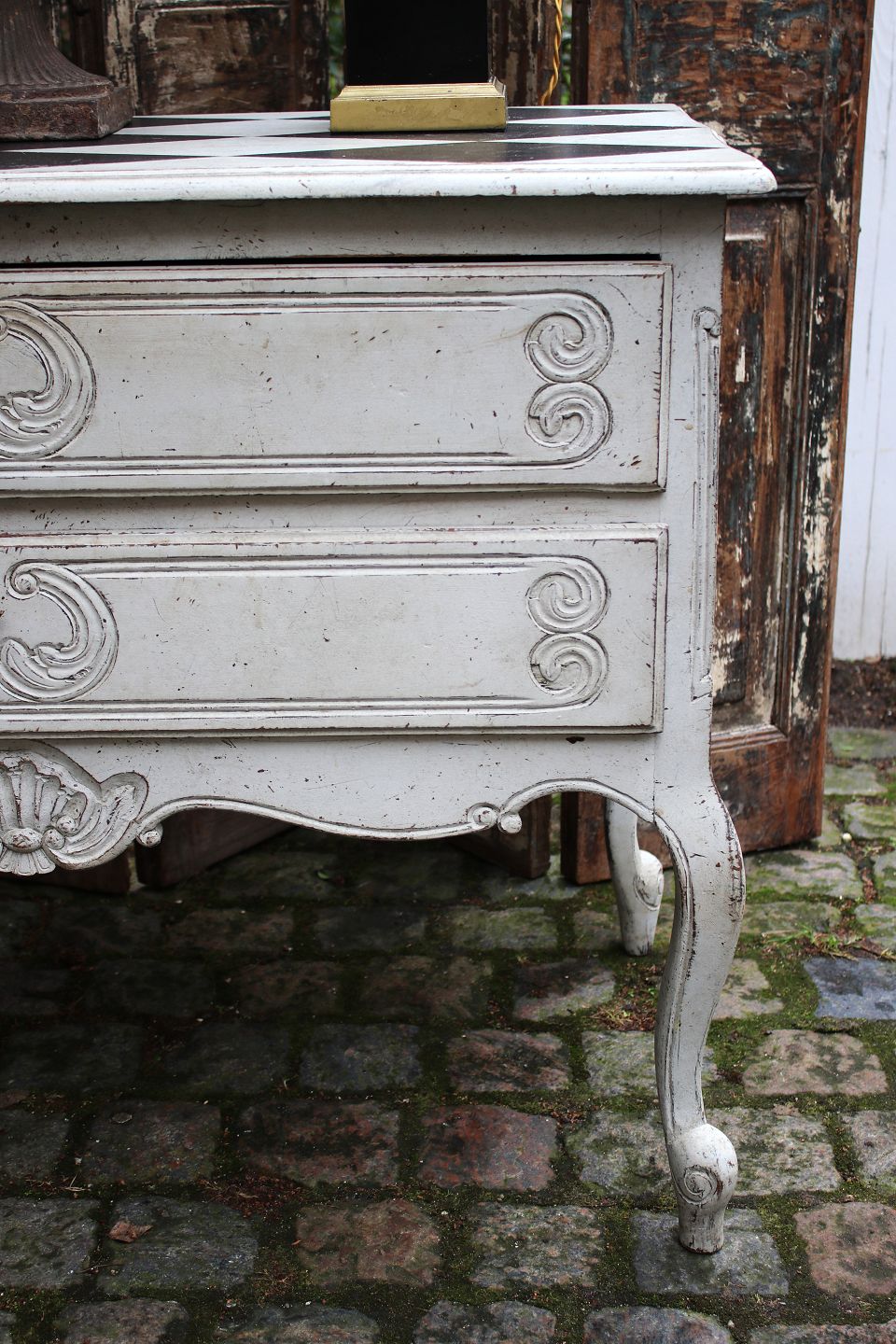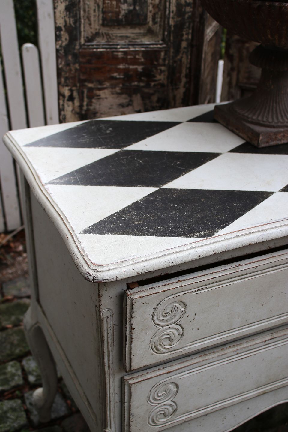 The chest of drawers is painted in a fine Gustavian gray color with black and gray checks on the top plate.