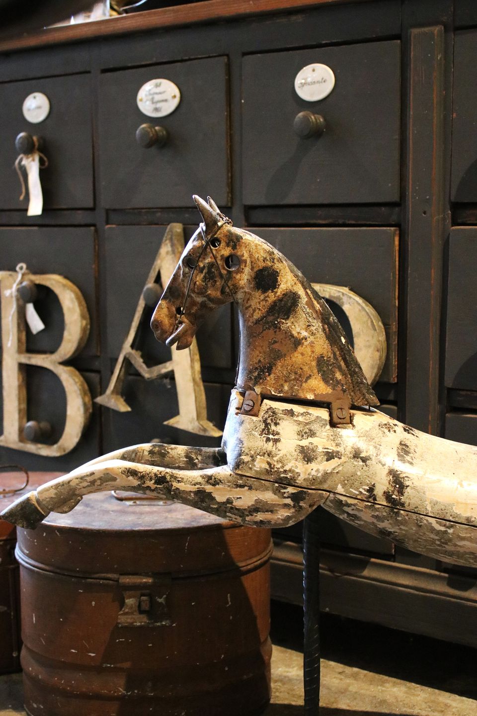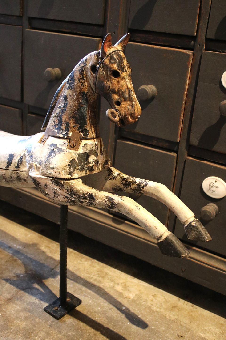 Dekorativ , fransk 1800 tals træ hest med hoved i jern og gammel bemaling med en rigtig fin patina.