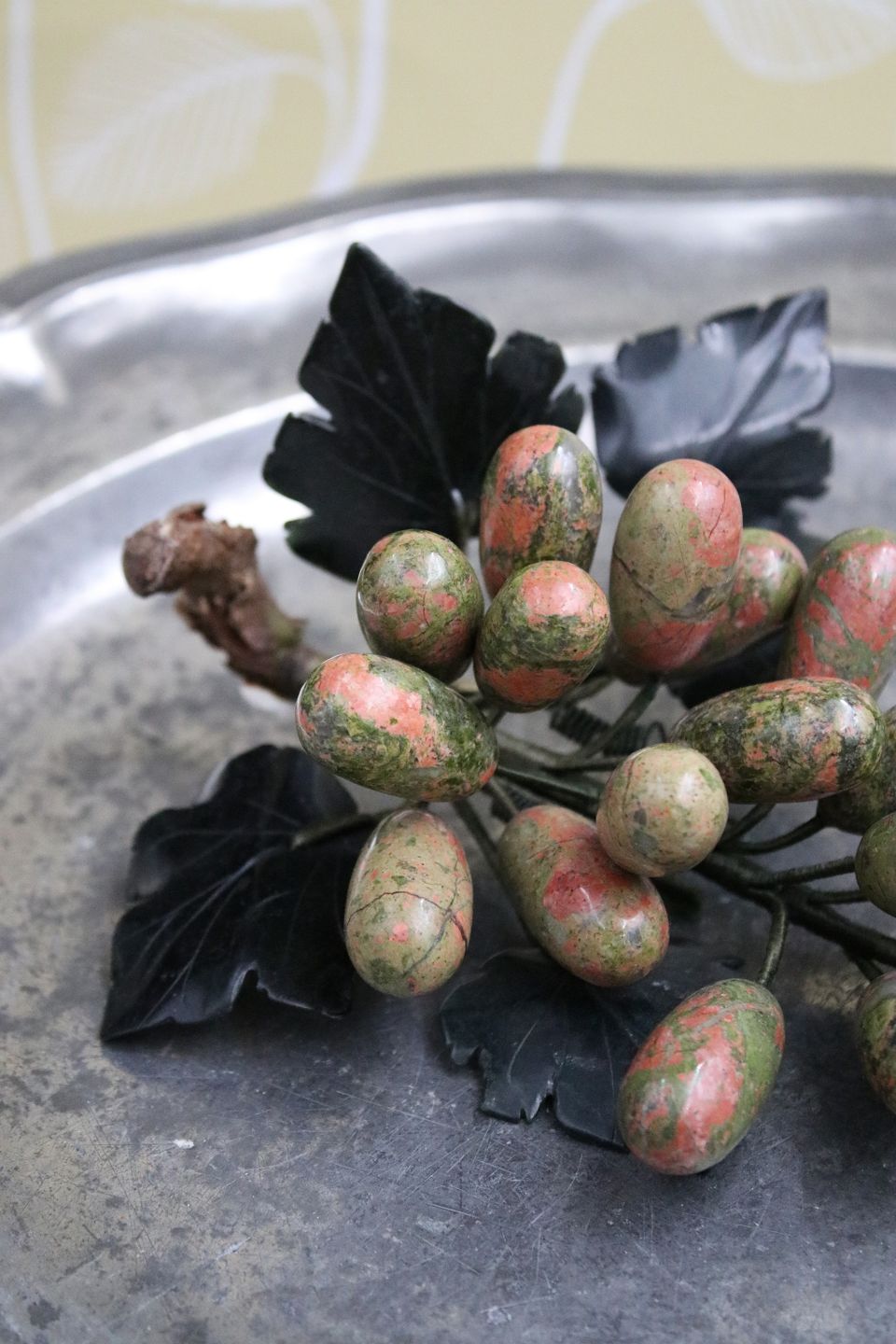 Decorative, old bunch of grapes in colored jade. Length: 18cm. Item number: Vindrueklase nr.2