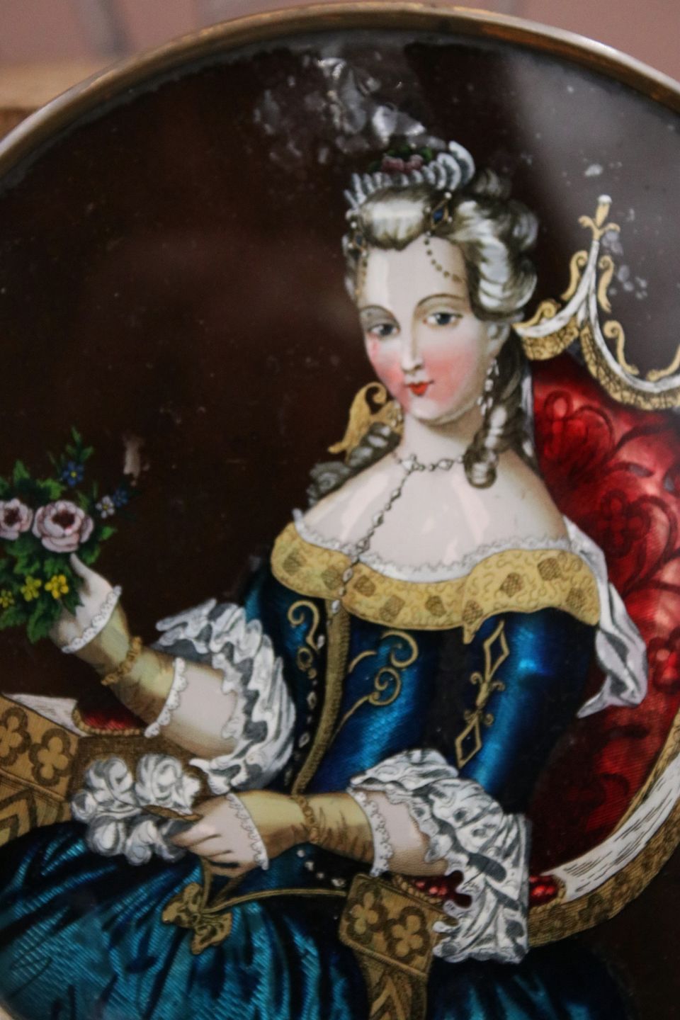 Decorative, French 19th century candy box made of cardboard with brass edges and stained glass on top with a motif of a fine French woman.