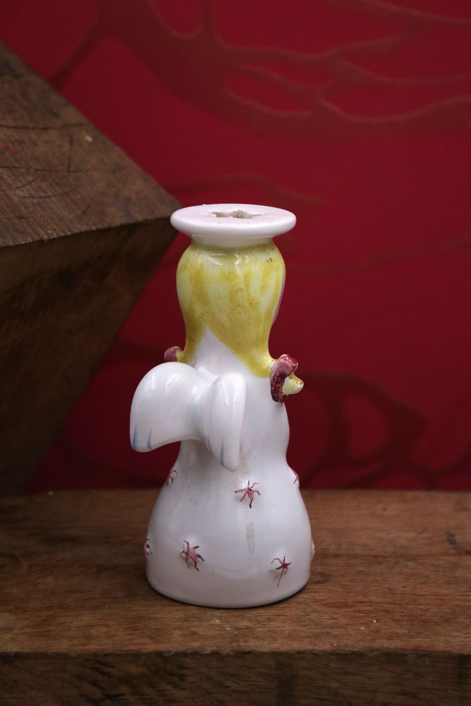 Nymølle jule engel med gult hår i fajance med plads til lille grangren eller stearinlys i toppen. H: 12cm. Emne nummer: Nymølle engel 2
